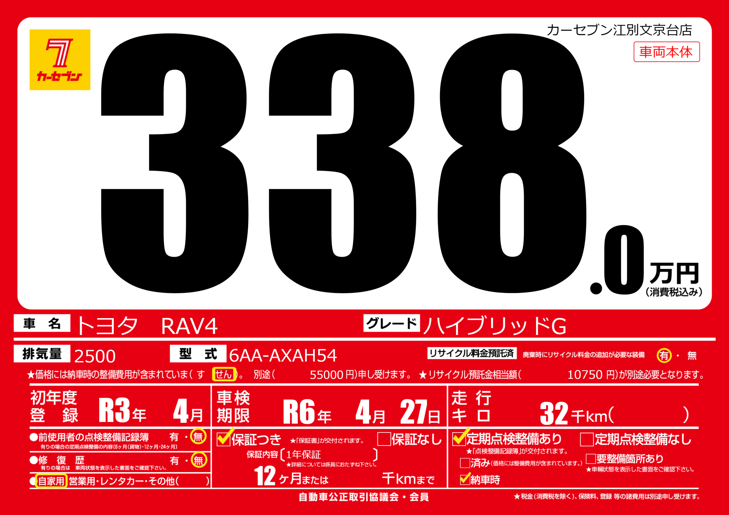 | 車名 | トヨタ RAV4 | グレード ミッション 排気量 |