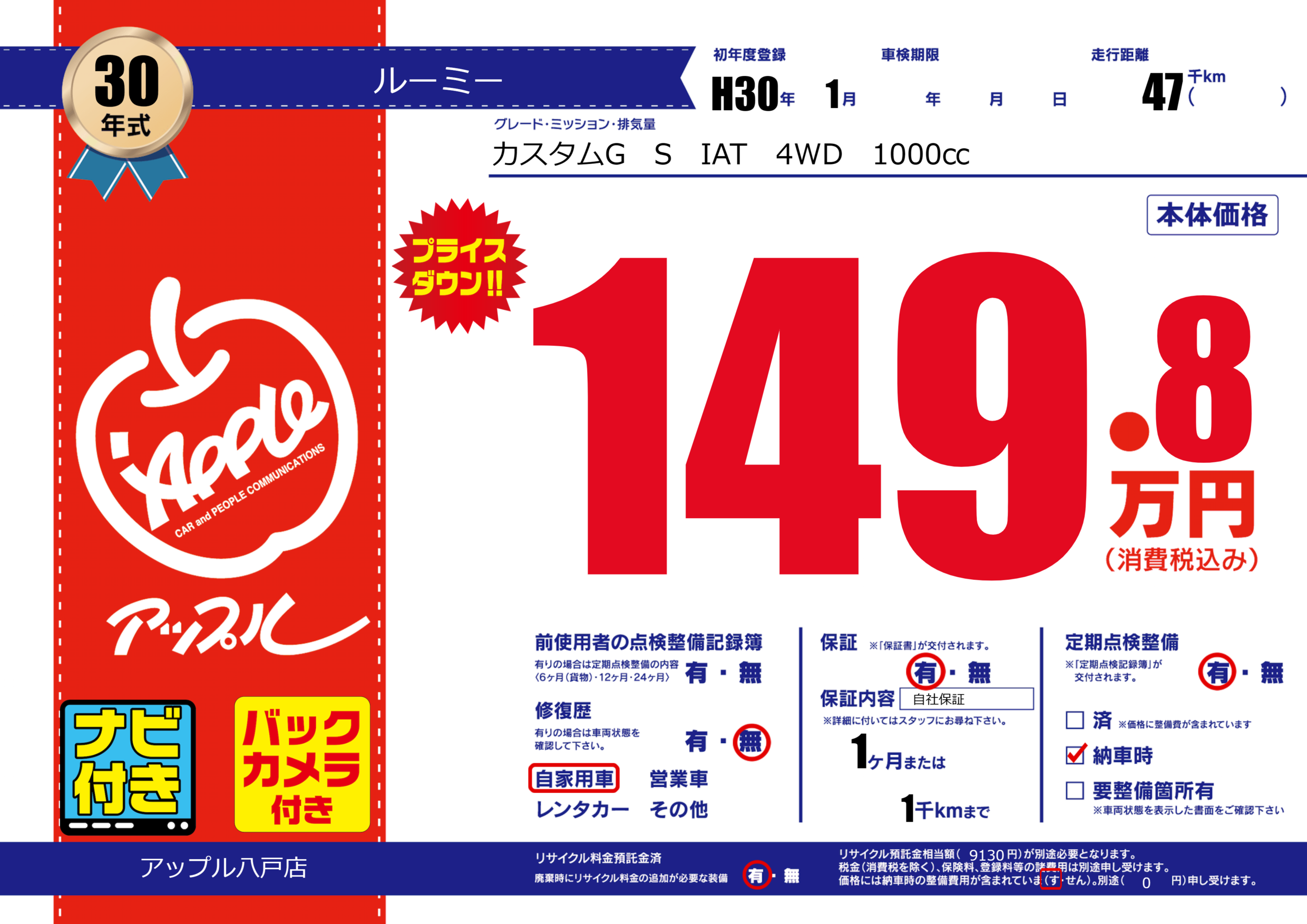 | 車名 | ルーミー | グレード ミッション 排気量 |