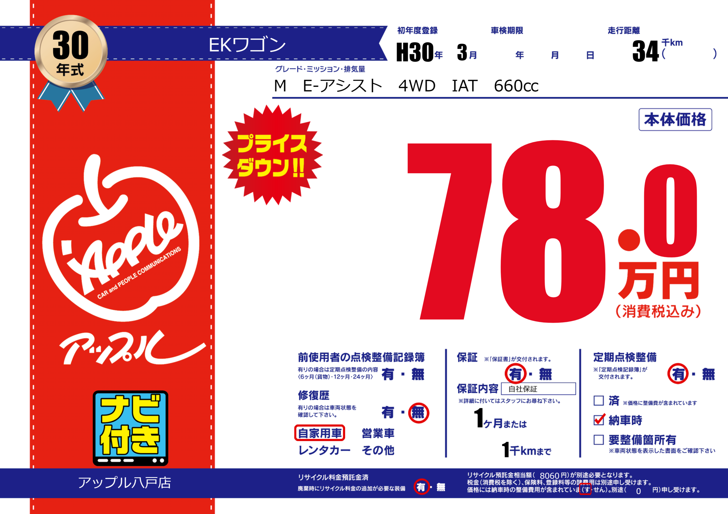 保証付き 保証内容( 自社保証) 1ヶ月または(1)千kmまで |