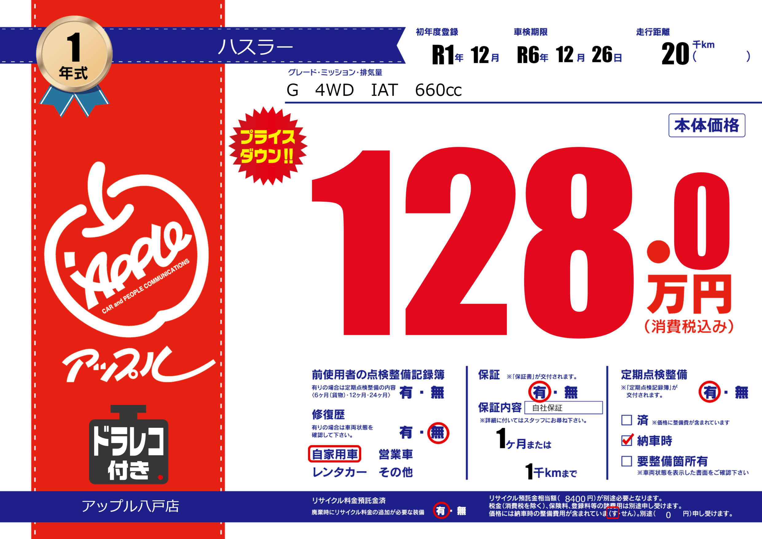 | 走行キロ | 2万km | 初年度登録 | R1年12月 |