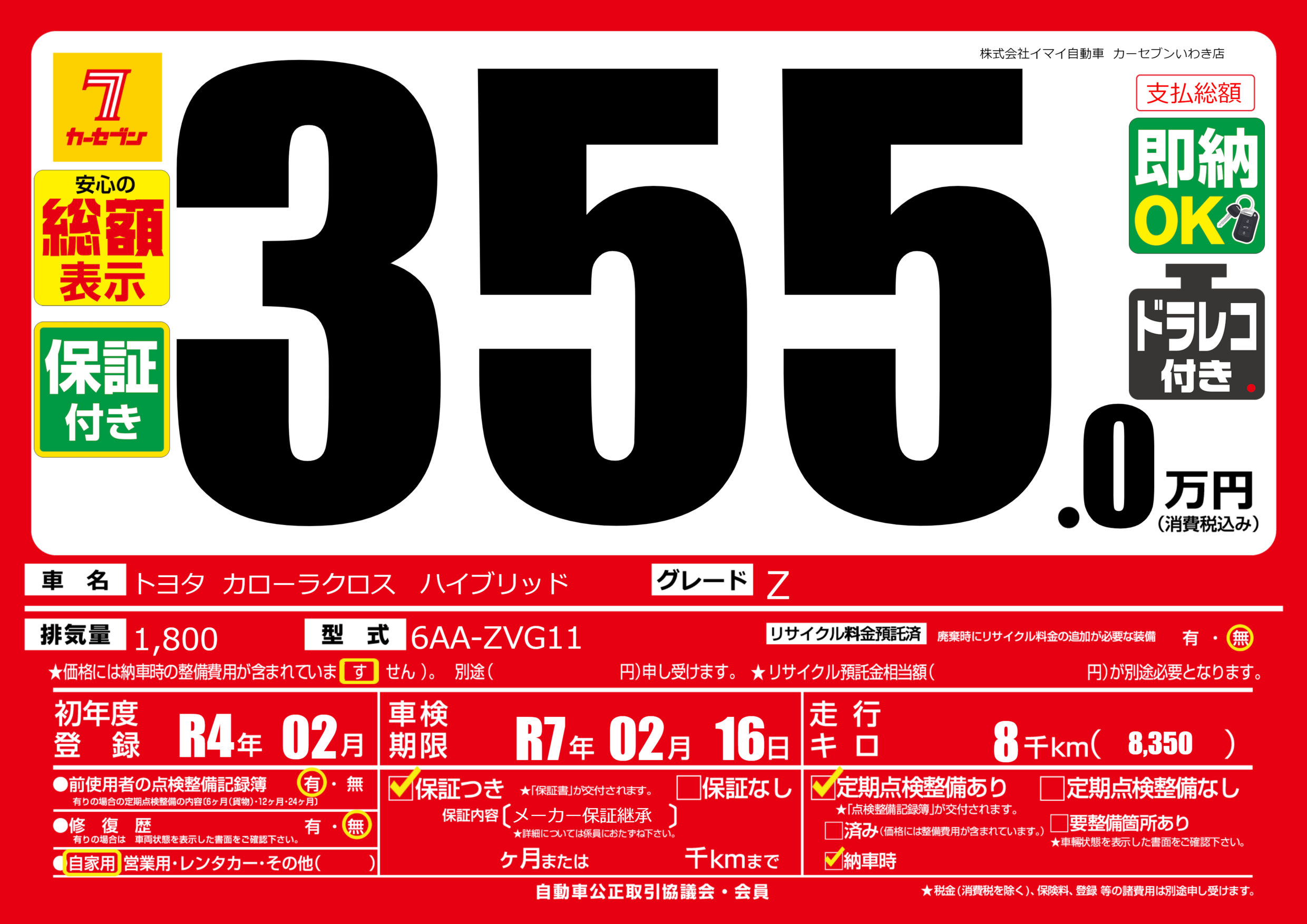 | 走行キロ | 0.8万km | 初年度登録 | R4年02月 |