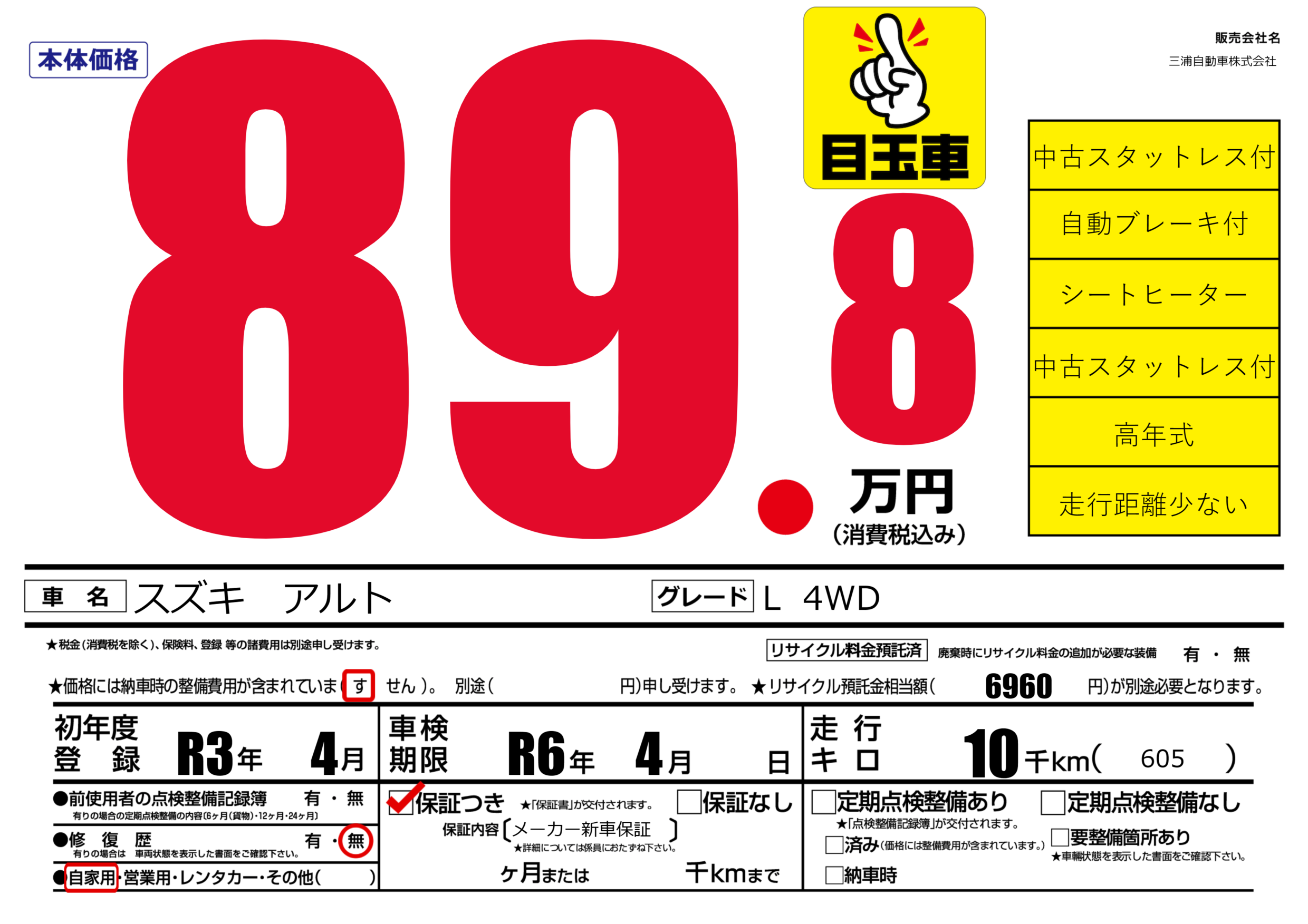| 車名 | スズキ アルト | グレード ミッション 排気量 |
