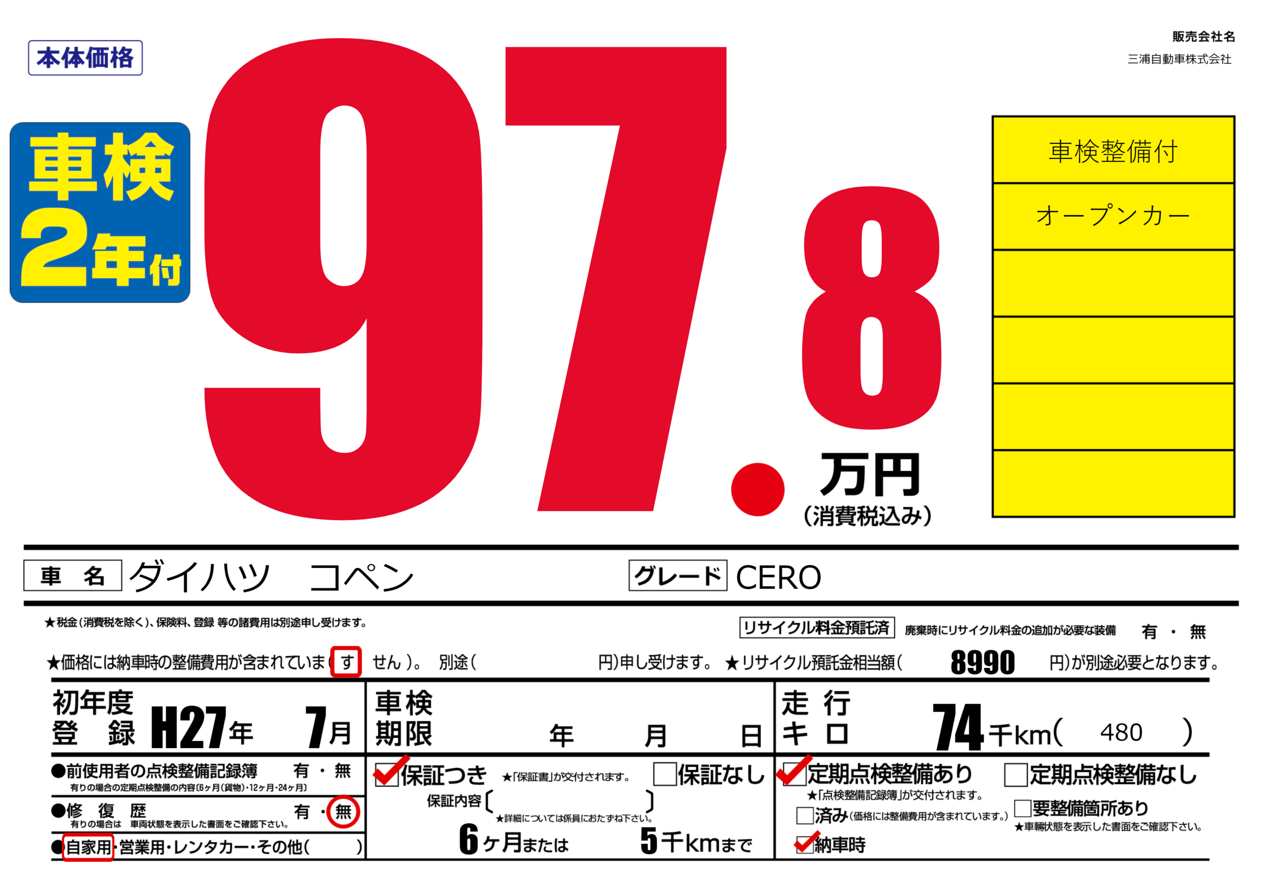 | 車名 | ダイハツ コペン | グレード ミッション 排気量 |