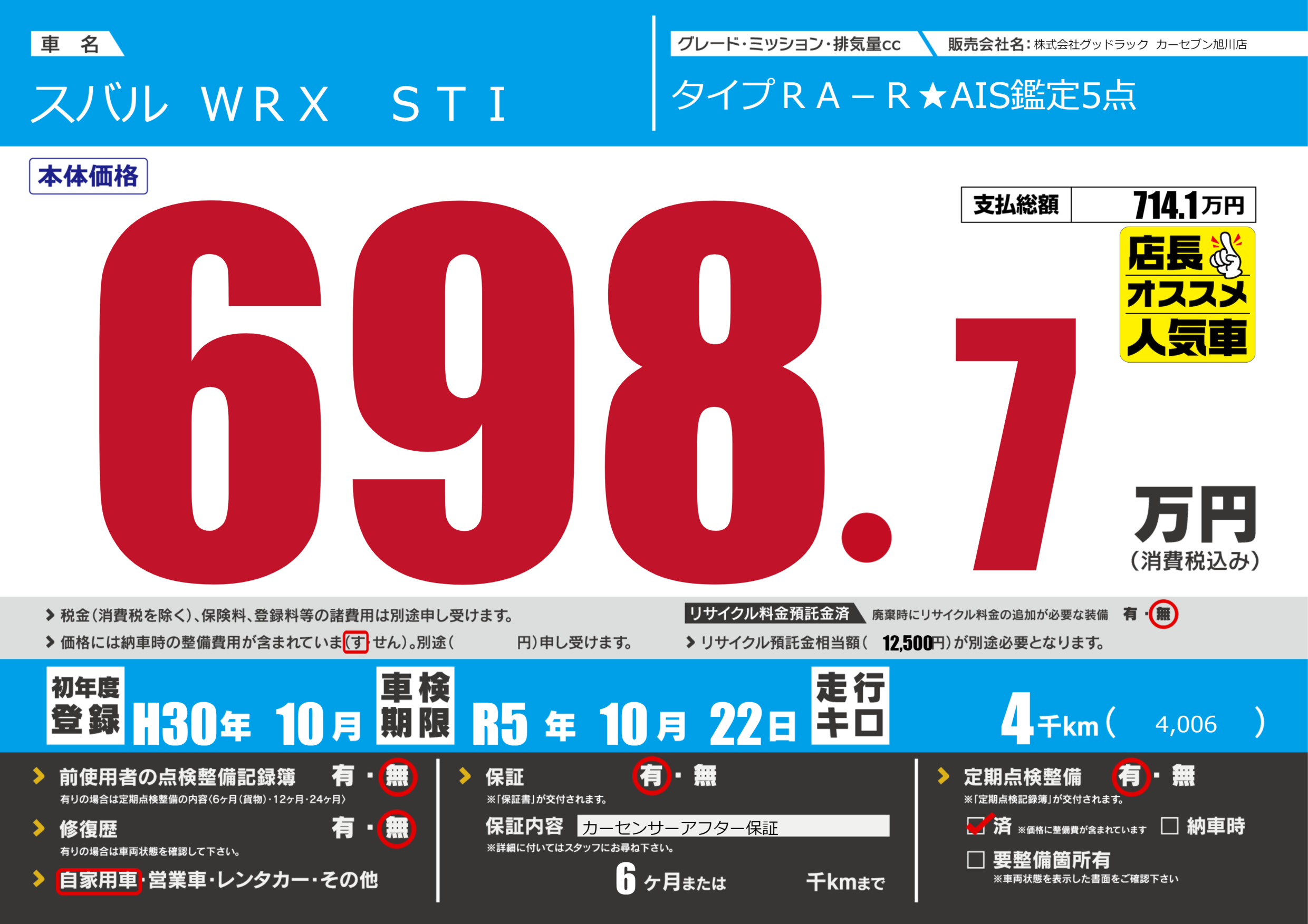 | 車名 | スバル WRX STI | グレード ミッション 排気量 |
