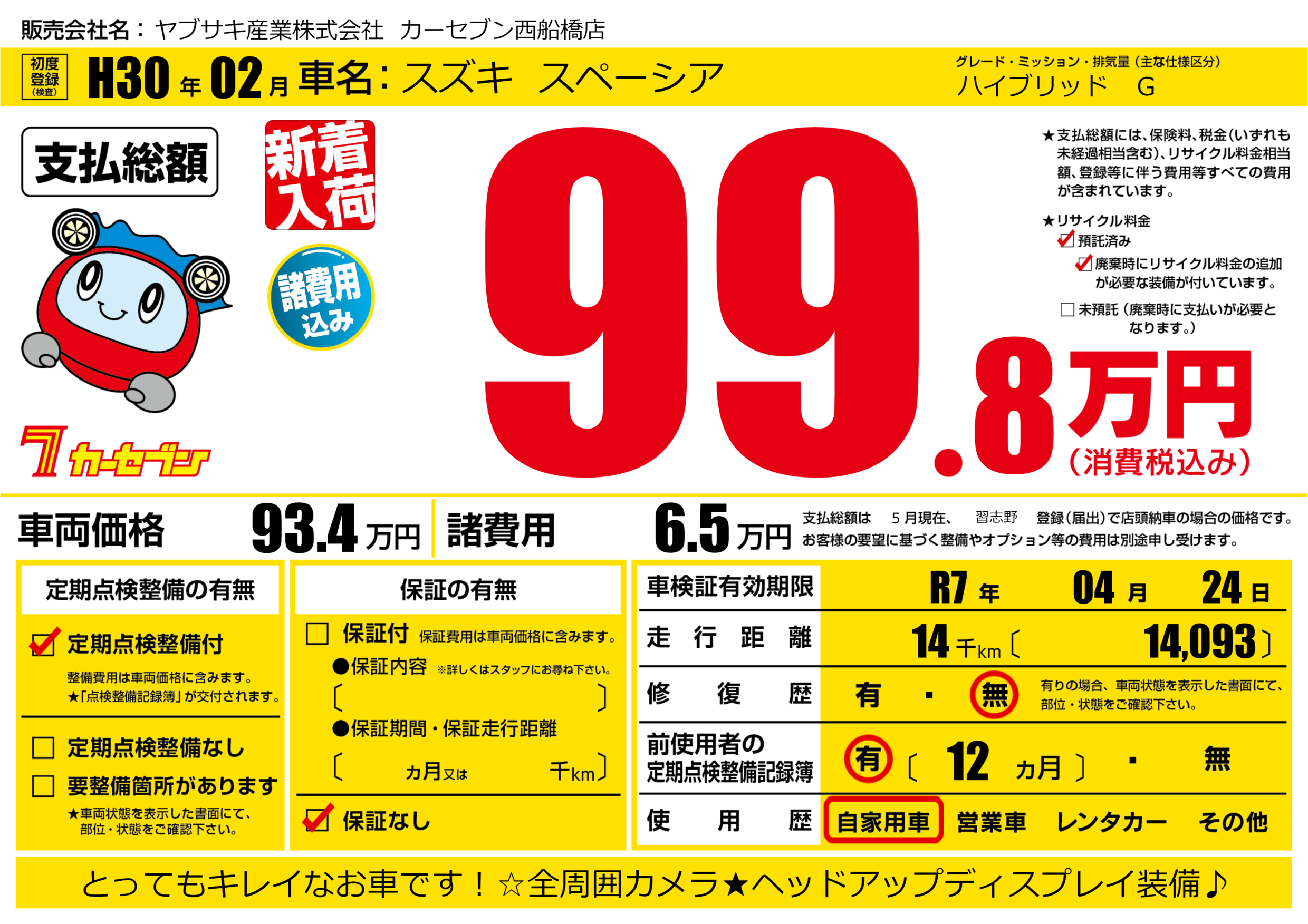 | 車名 | スズキ スペーシア | グレード ミッション 排気量 |