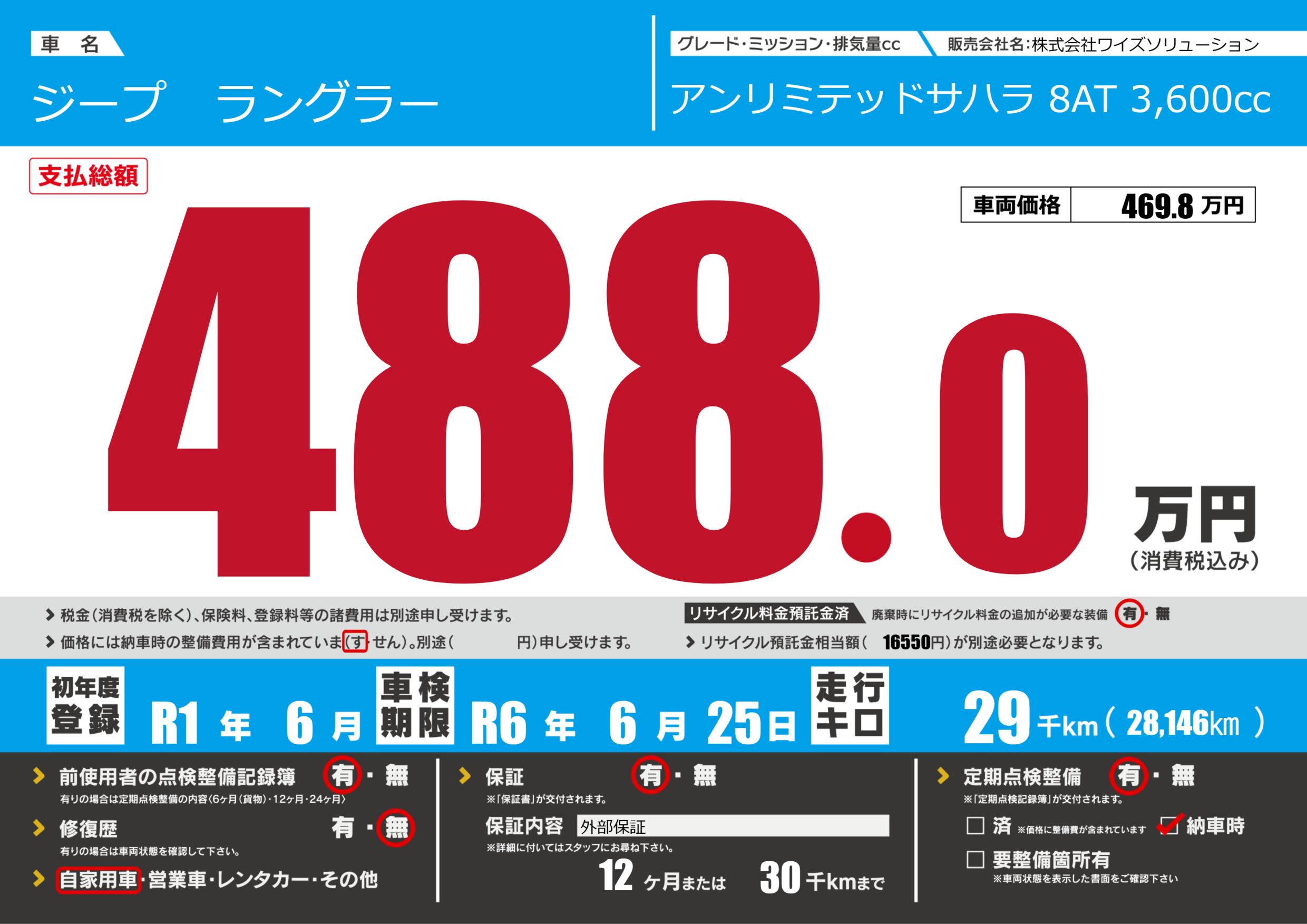 | 車名 | ジープ ラングラー | グレード ミッション 排気量 |