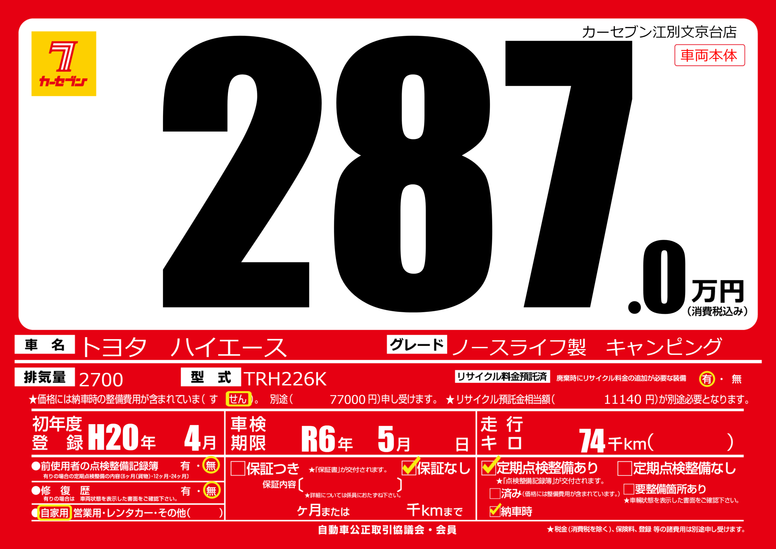 | 走行キロ | 7.4万km | 初年度登録 | H20年4月 |