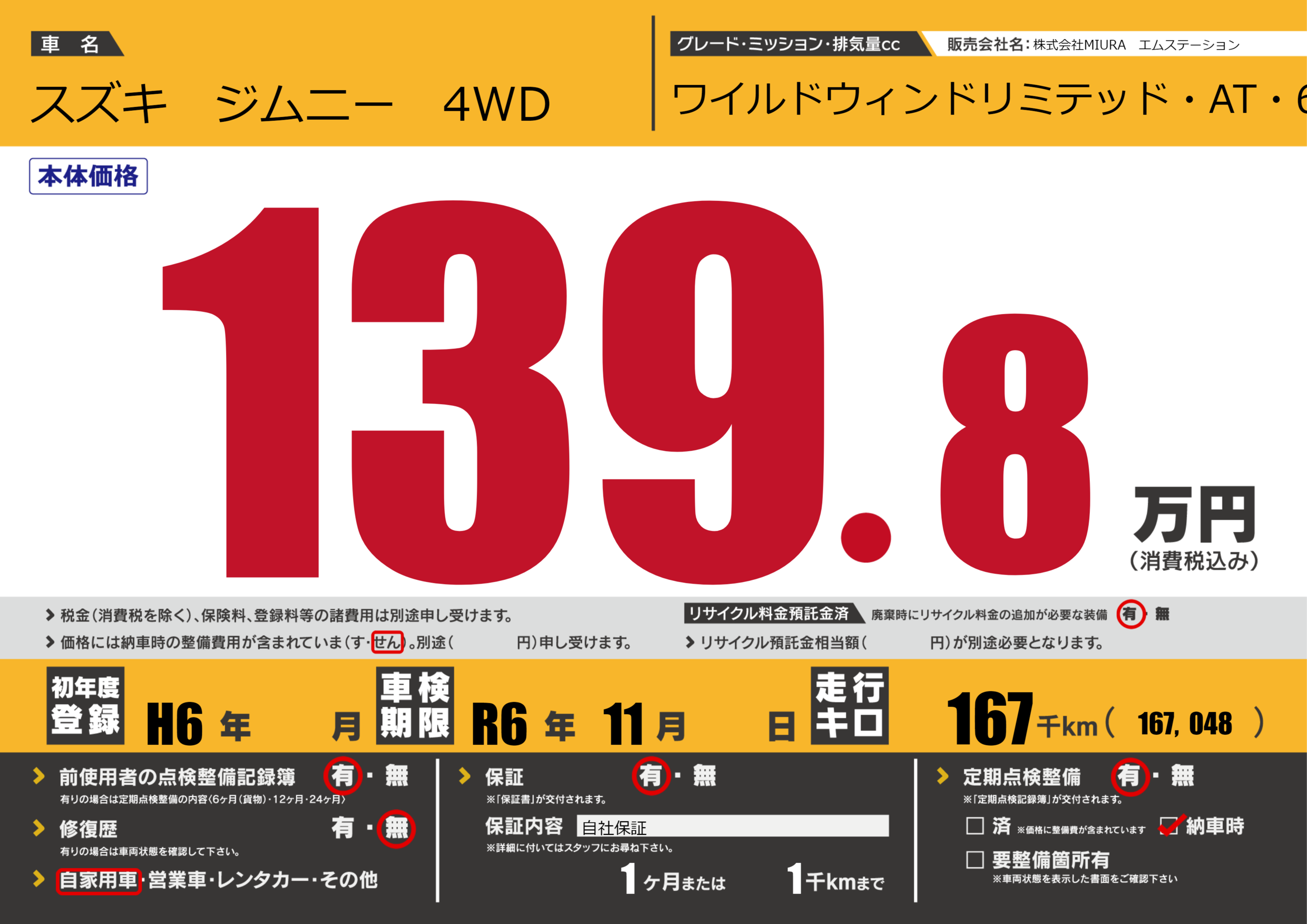 | 車名 | スズキ ジムニー 4WD | グレード ミッション 排気量 |