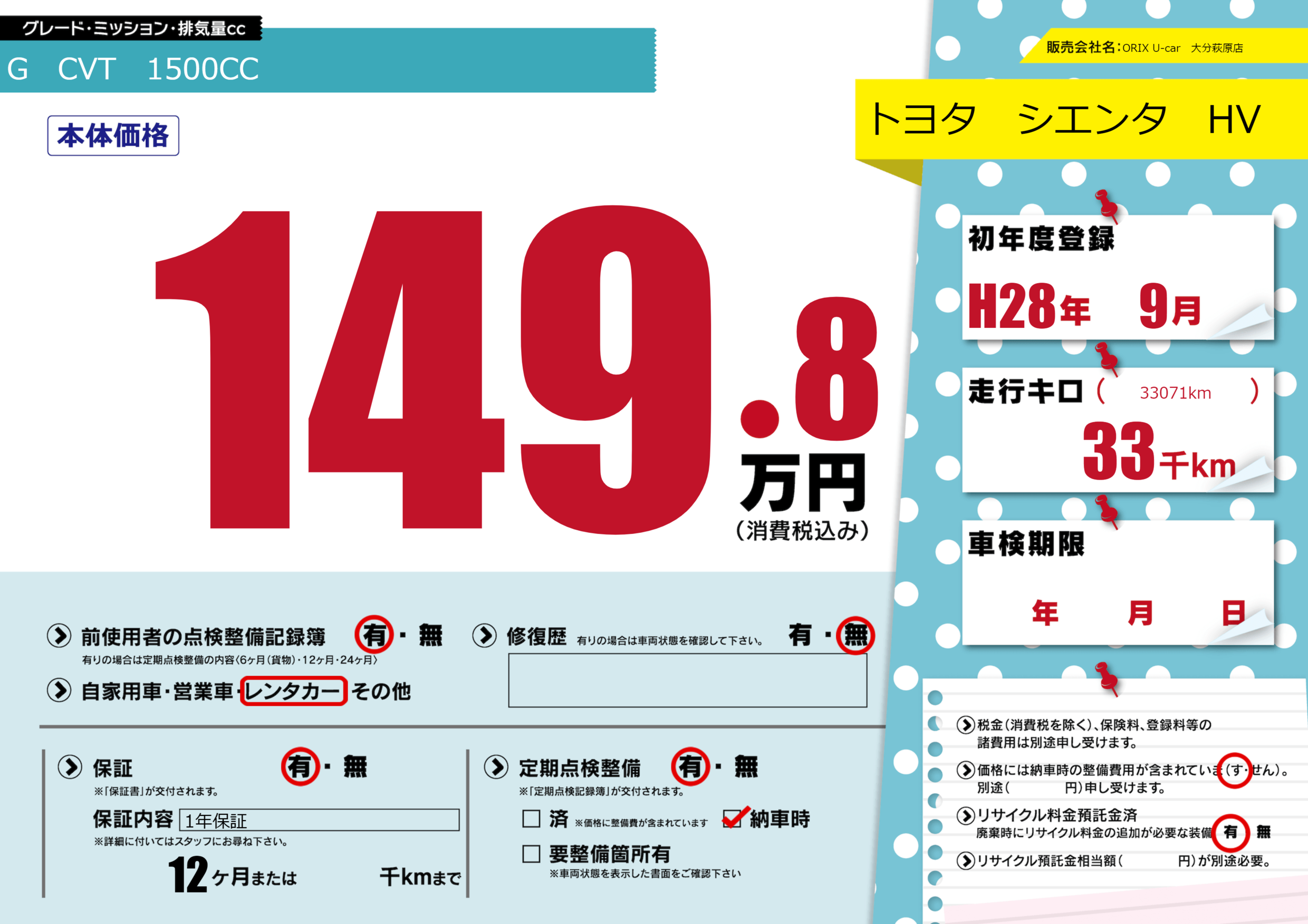 保証付き 保証内容(1年保証) 12ヶ月または()千kmまで |