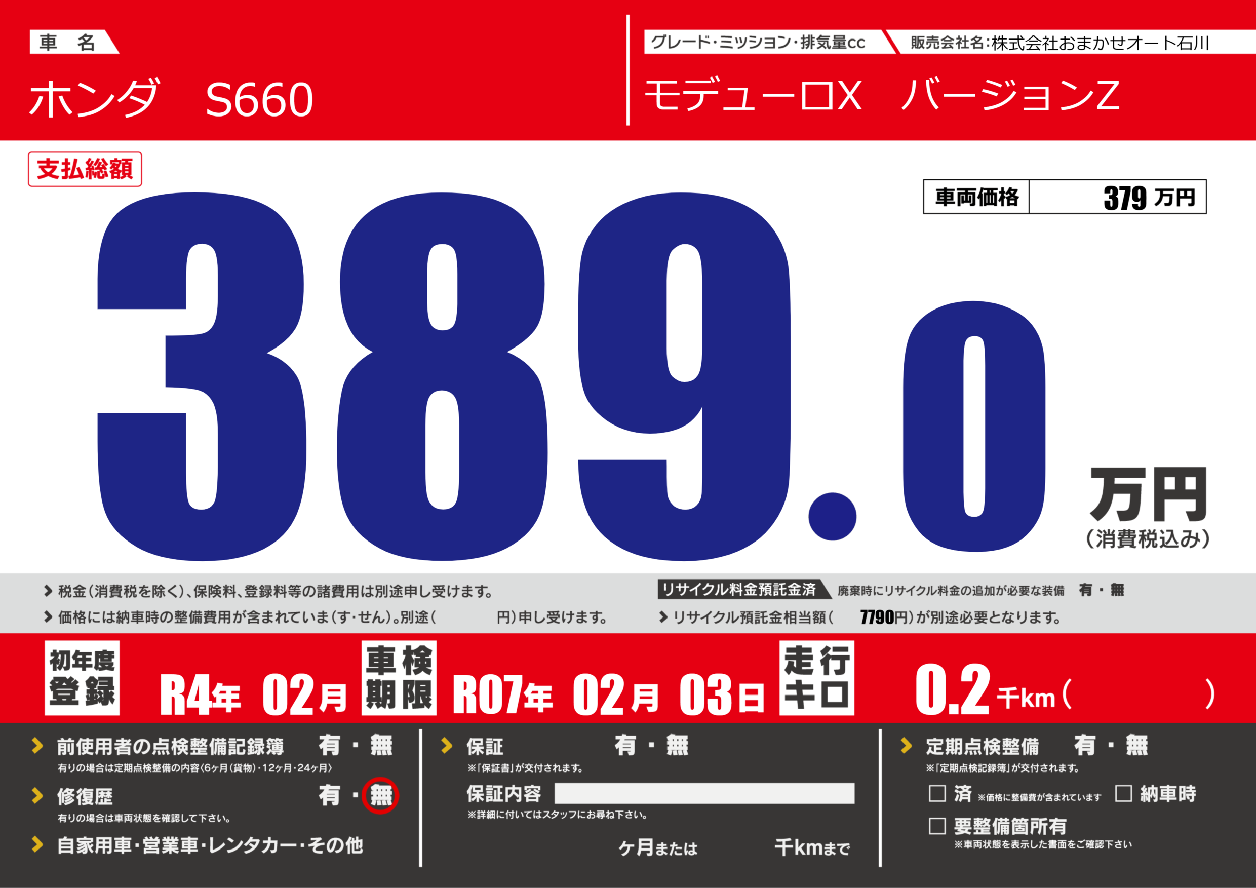 | 車名 | ホンダ S660 | グレード ミッション 排気量 |