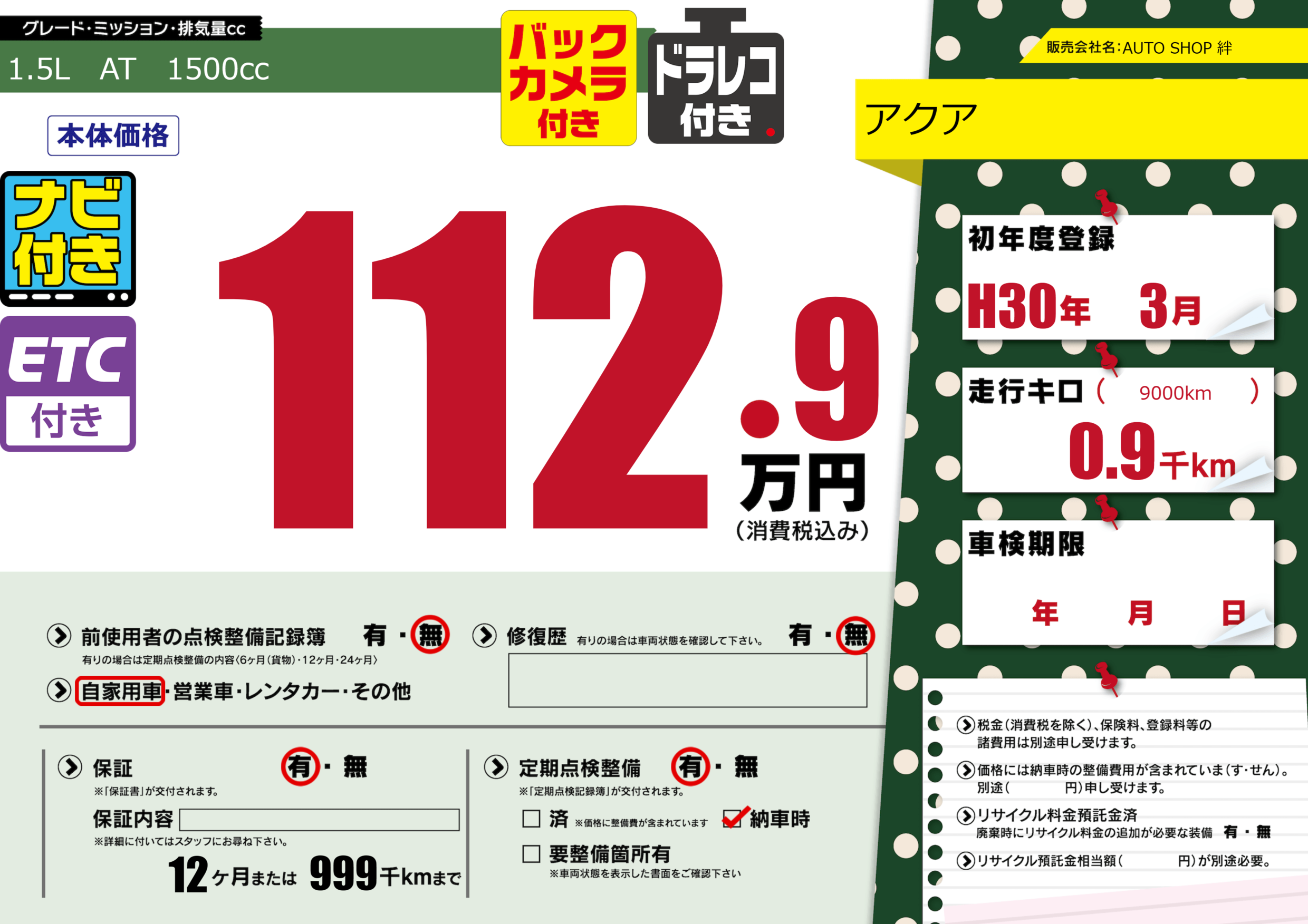 保証付き 保証内容(---) 12ヶ月または(999)千kmまで |
