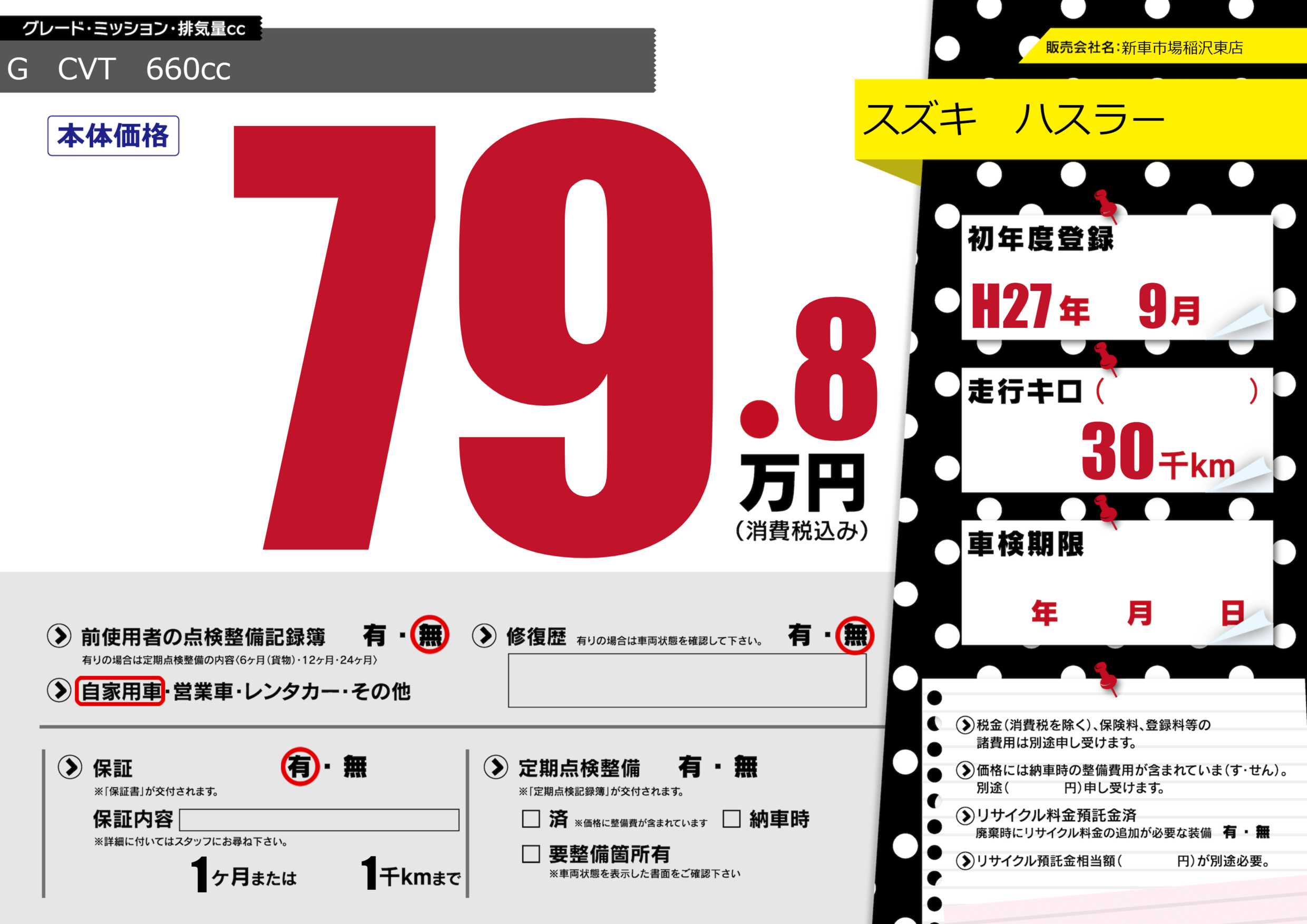| 車名 | スズキ ハスラー | グレード ミッション 排気量 |