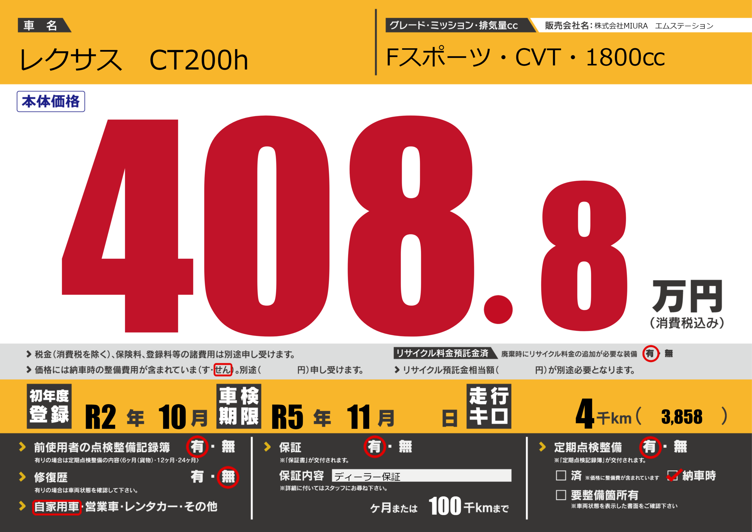 保証付き 保証内容(ディーラー保証) ---ヶ月または(100)千kmまで |