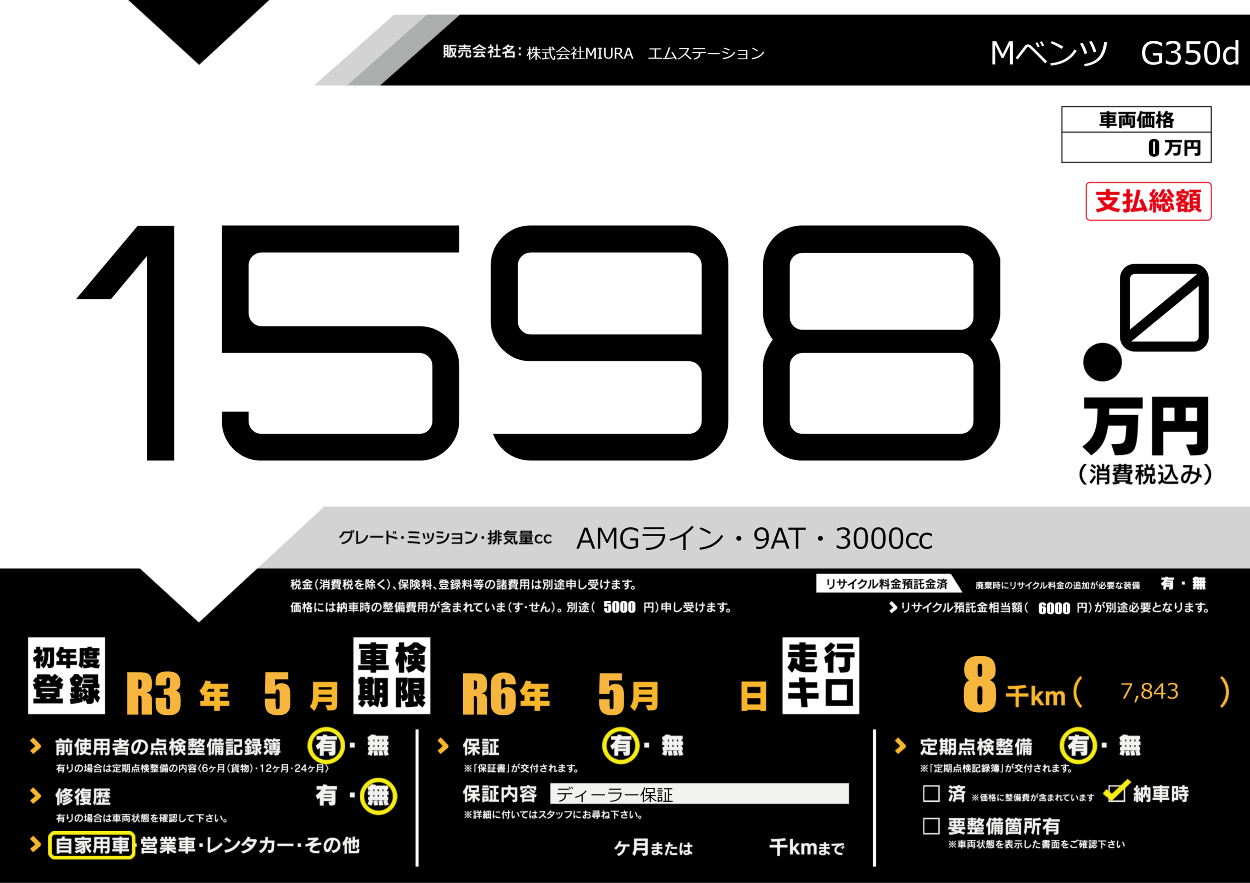| 車名 | Mベンツ G350d | グレード ミッション 排気量 |