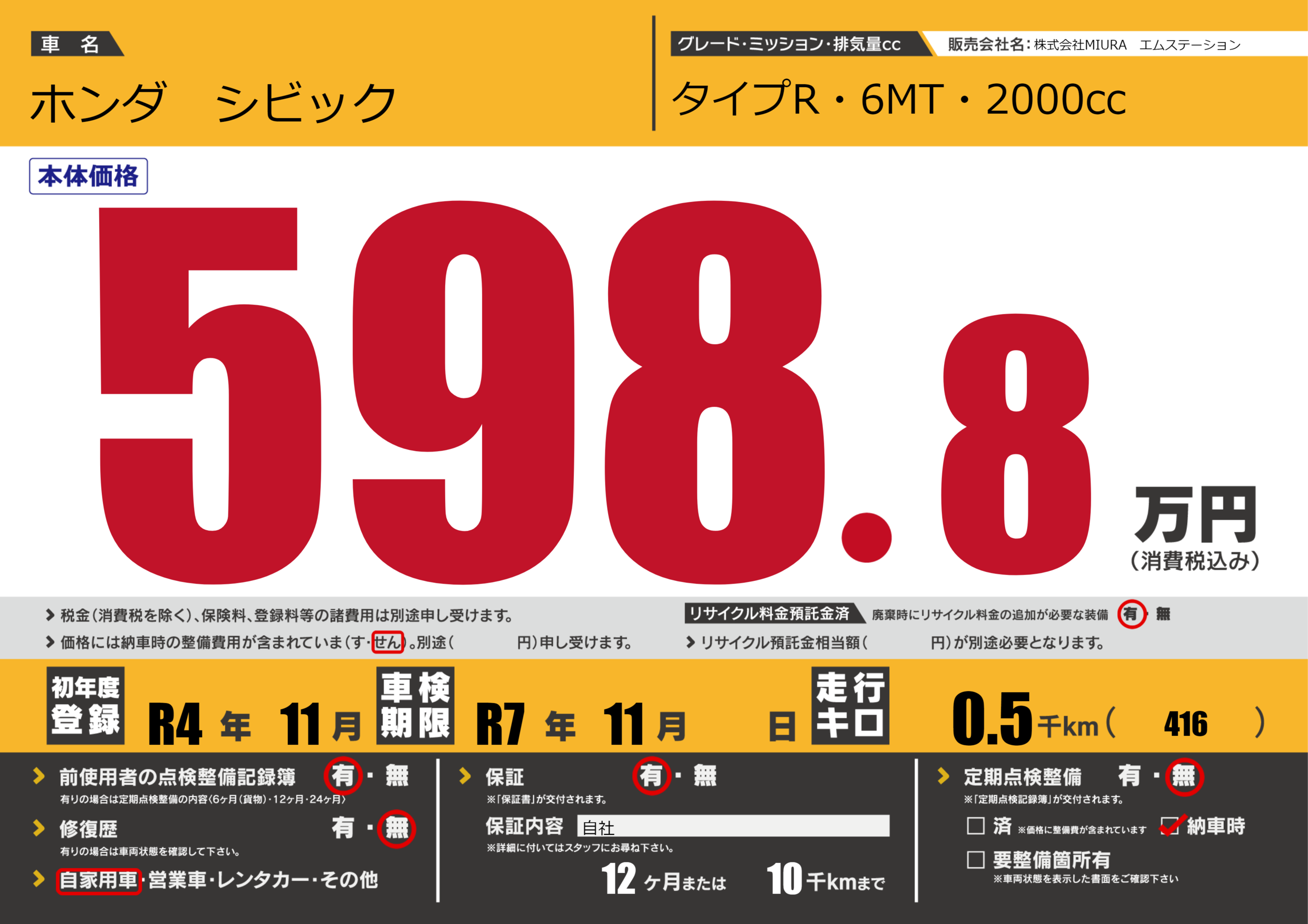 保証付き 保証内容(自社) 12ヶ月または(10)千kmまで |
