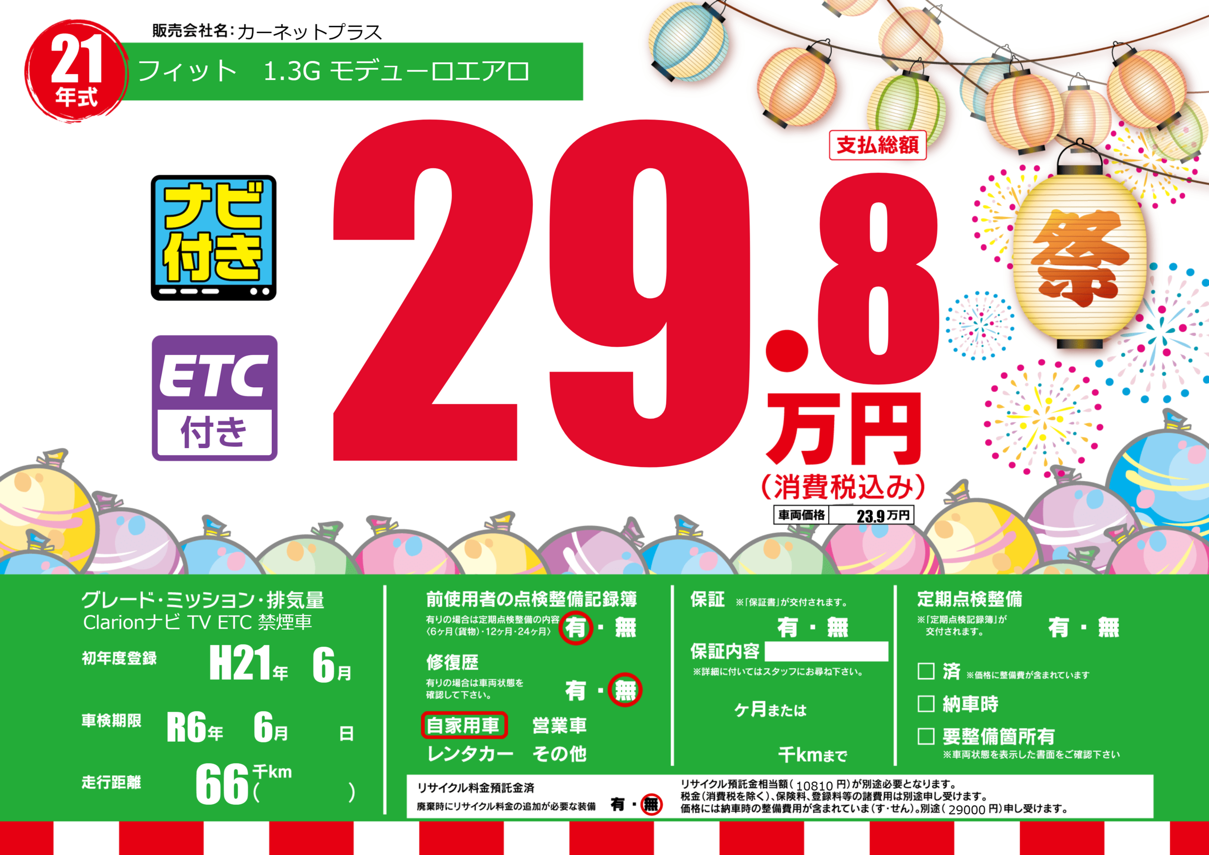 | 車名 | フィット 1.3G モデューロエアロ | グレード ミッション 排気量 |