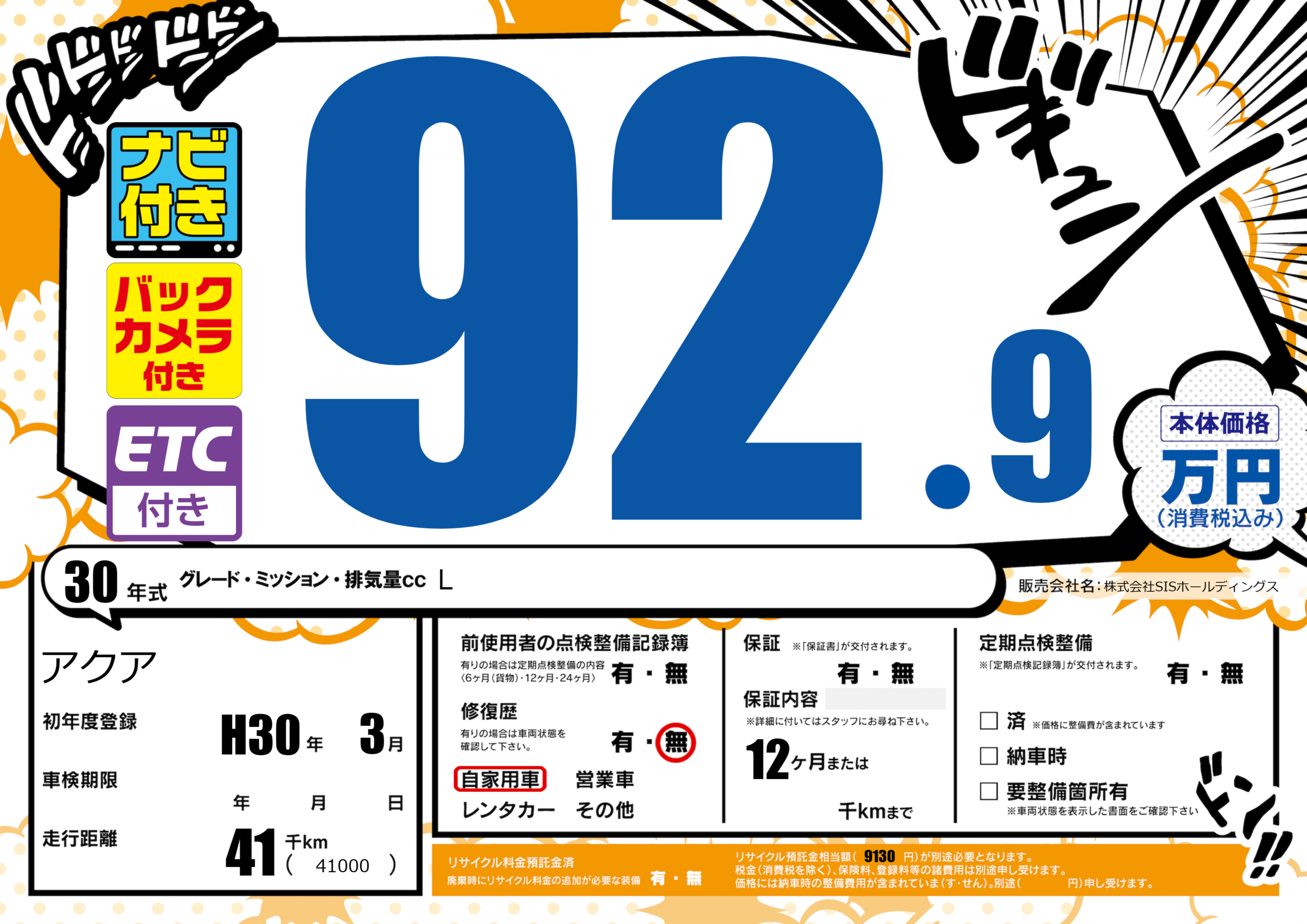 | 走行キロ | 4.1万km | 初年度登録 | H30年3月 |