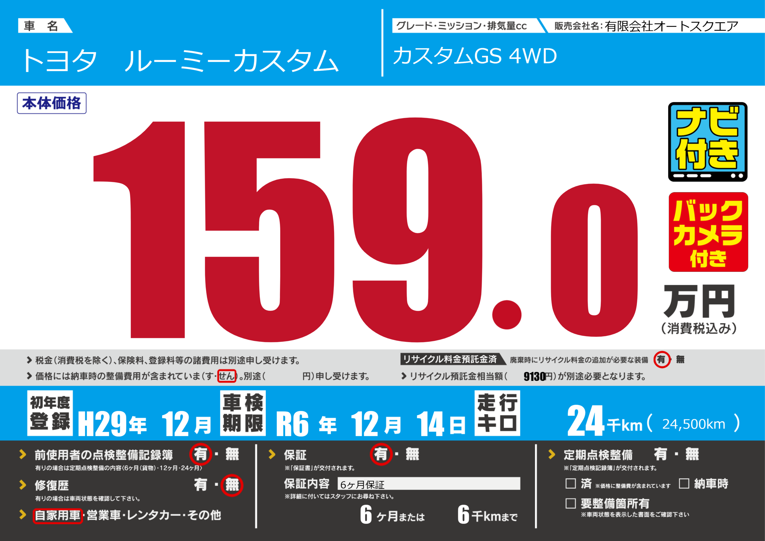 | 車名 | トヨタ ルーミーカスタム | グレード ミッション 排気量 |