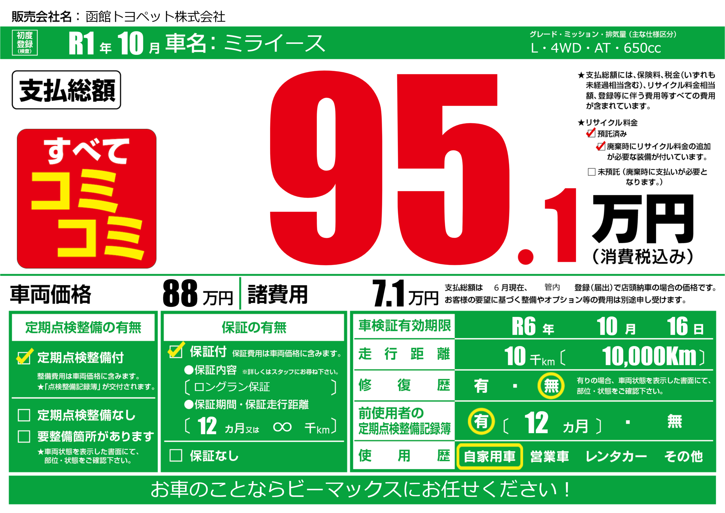 | 走行キロ | 1万km | 初年度登録 | R1年10月 |