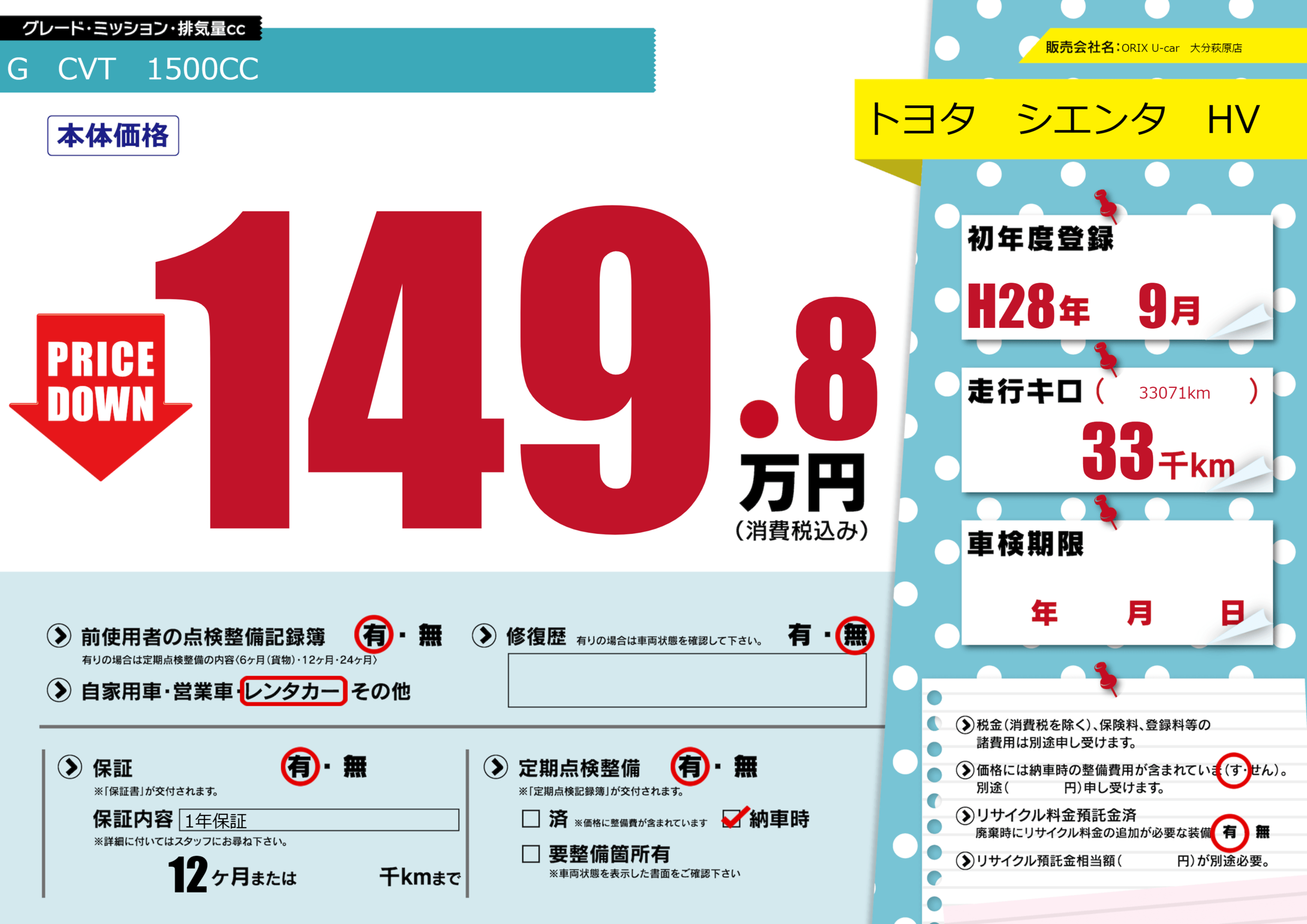 保証付き 保証内容(1年保証) 12ヶ月または()千kmまで |
