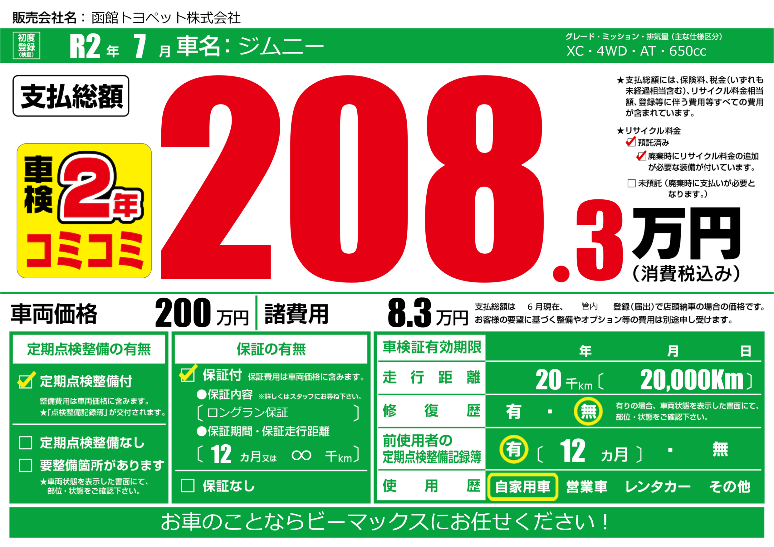 | 車名 | ジムニー | グレード ミッション 排気量 |