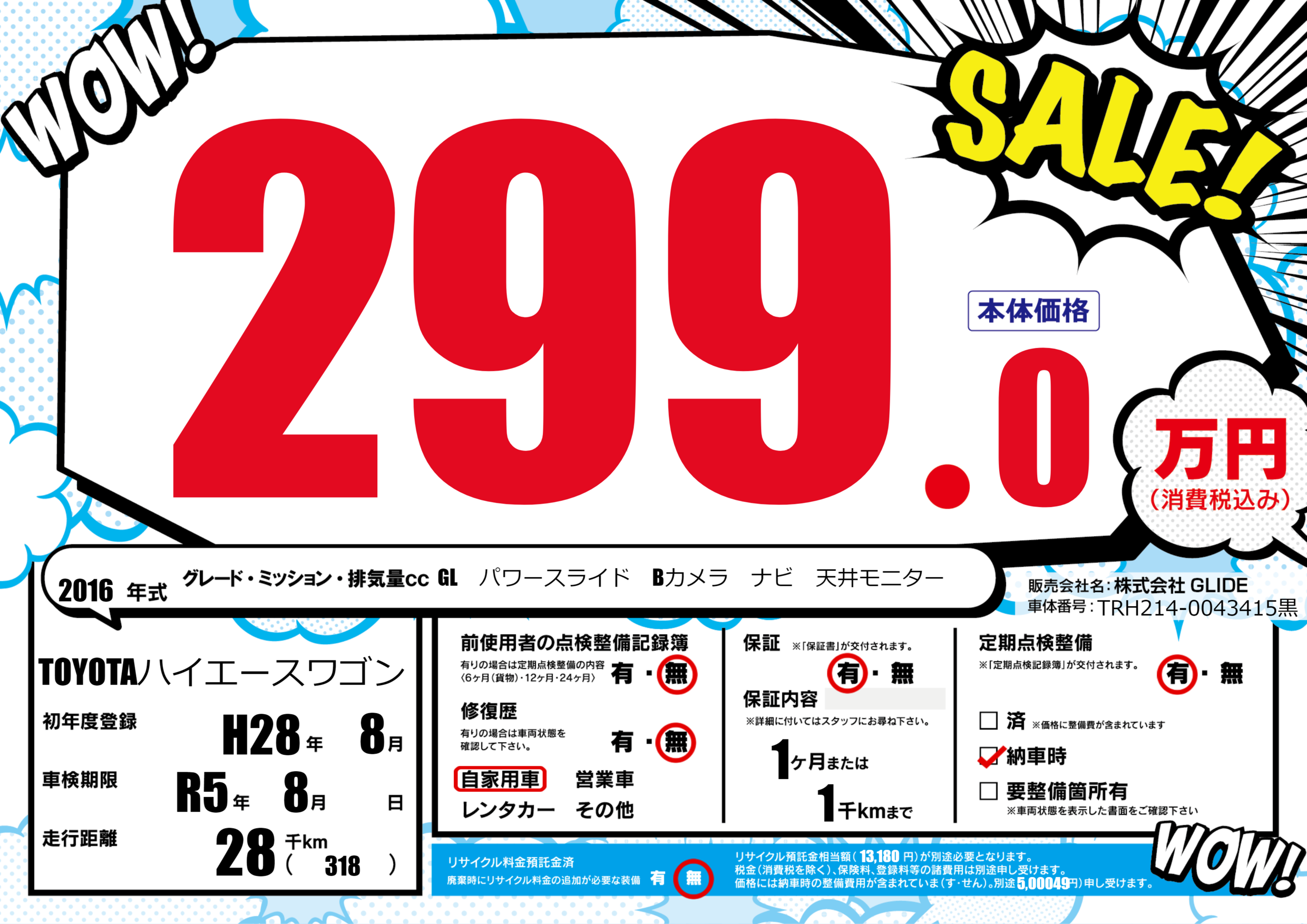 | 車名 | TOYOTAハイエースワゴン | グレード ミッション 排気量 |