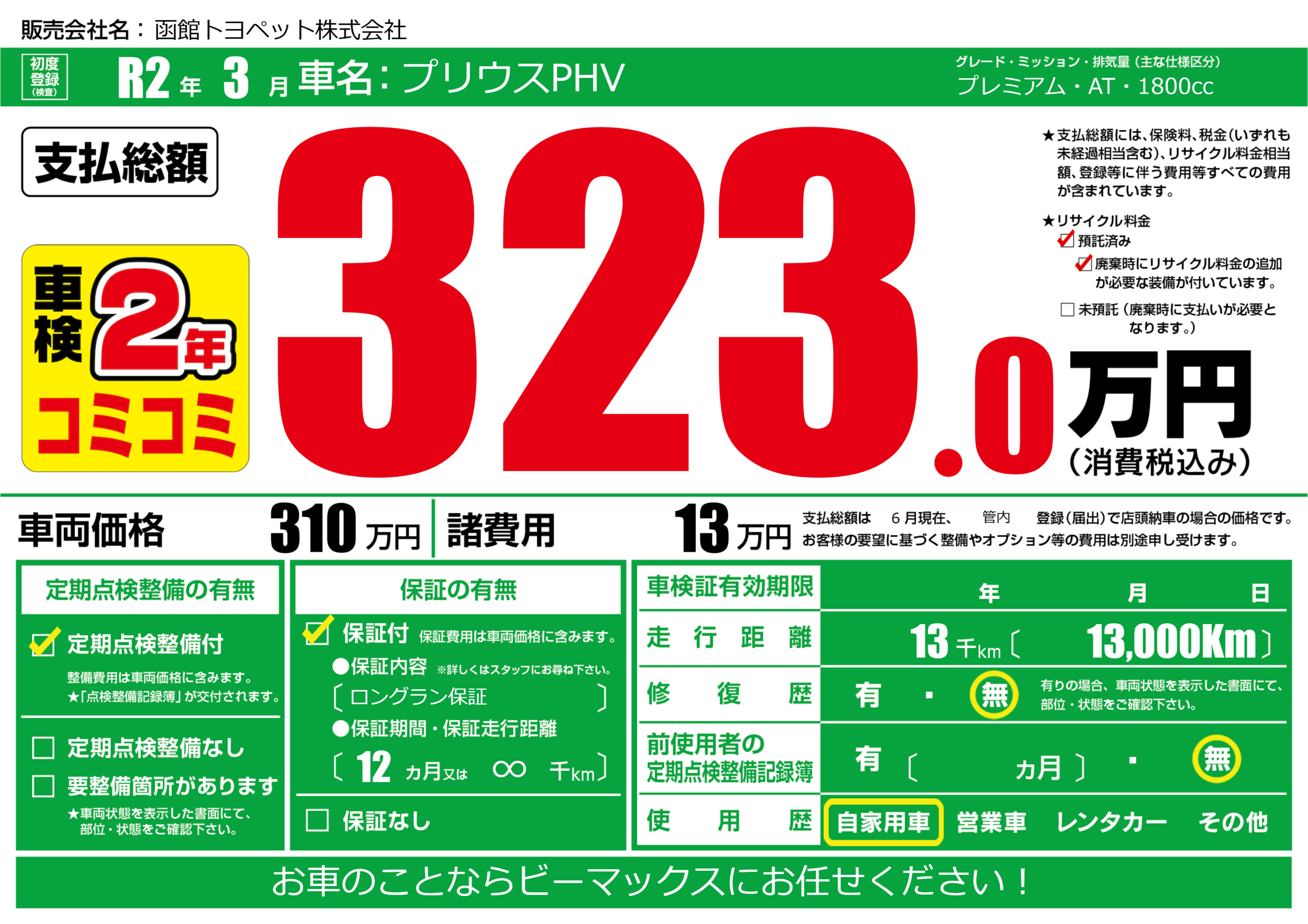 | 車名 | プリウスPHV | グレード ミッション 排気量 |