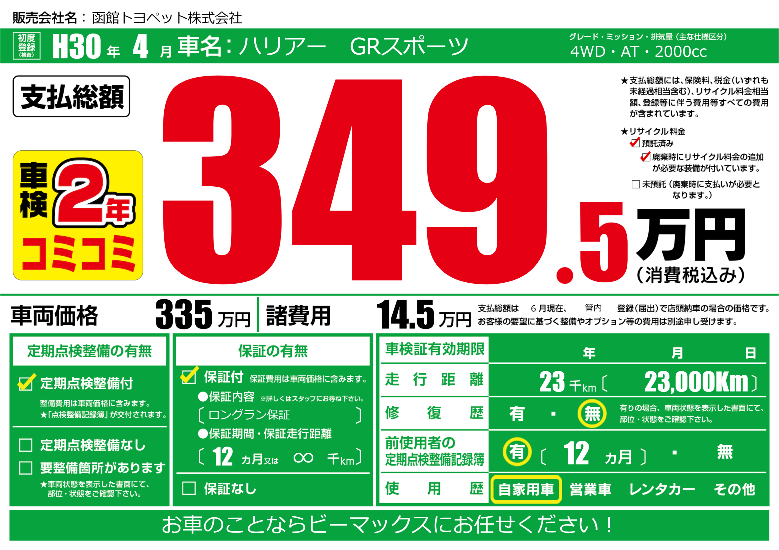 | 車名 | ハリアー GRスポーツ | グレード ミッション 排気量 |