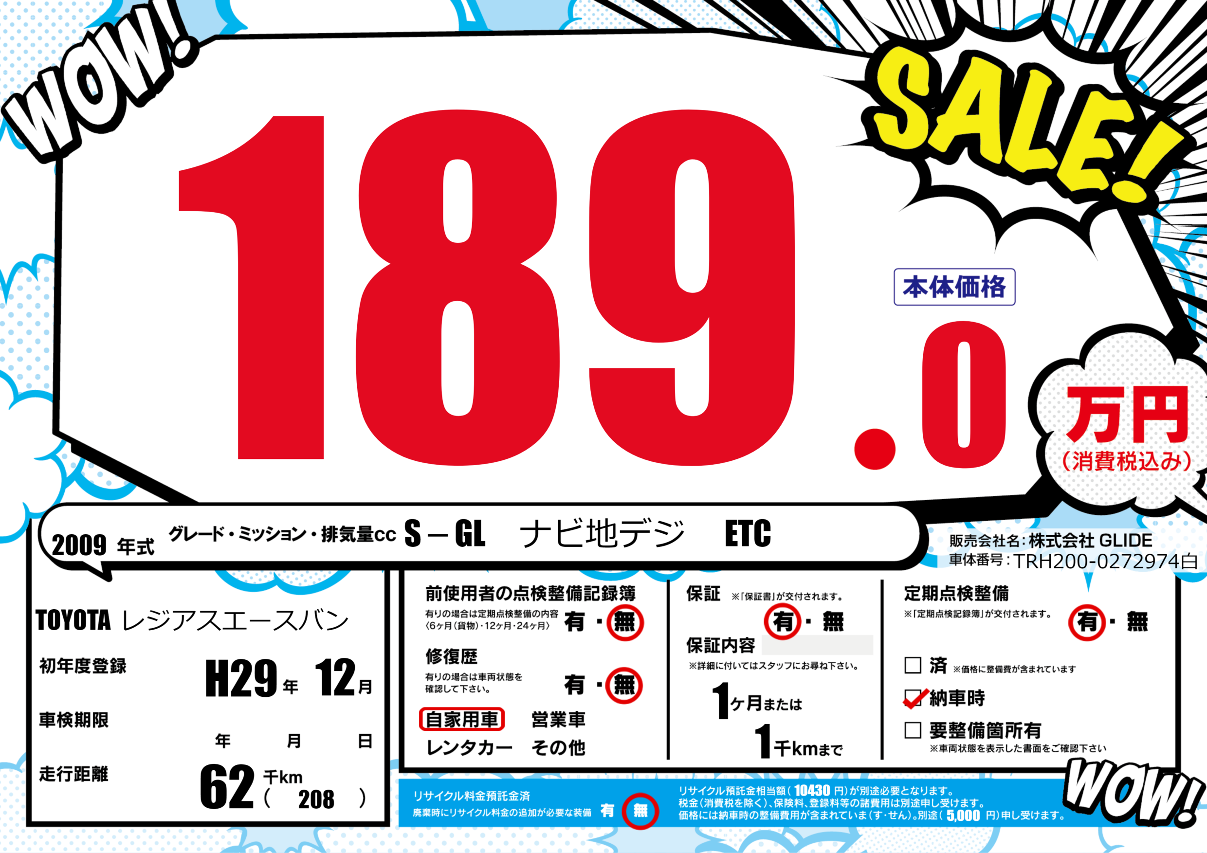 | 車名 | TOYOTA レジアスエースバン | グレード ミッション 排気量 |
