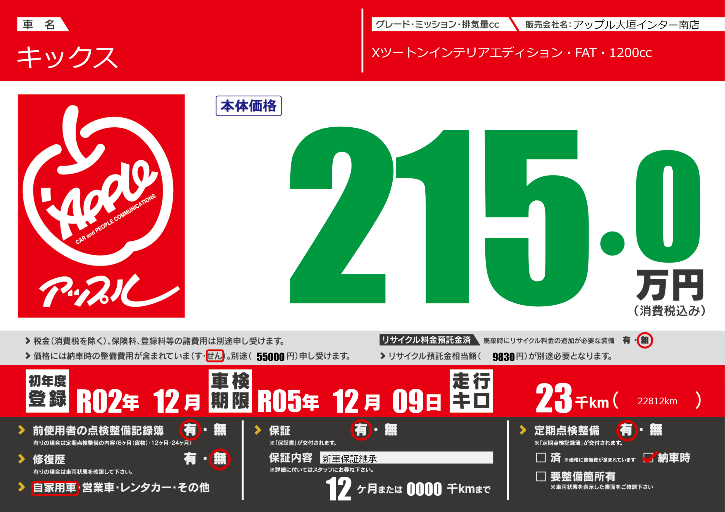 | 走行キロ | 2.3万km | 初年度登録 | R02年12月 |