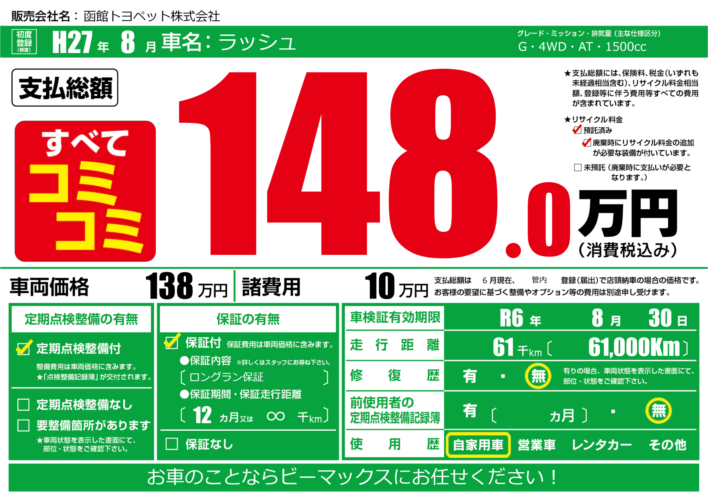 | 走行キロ | 6.1万km | 初年度登録 | H27年8月 |
