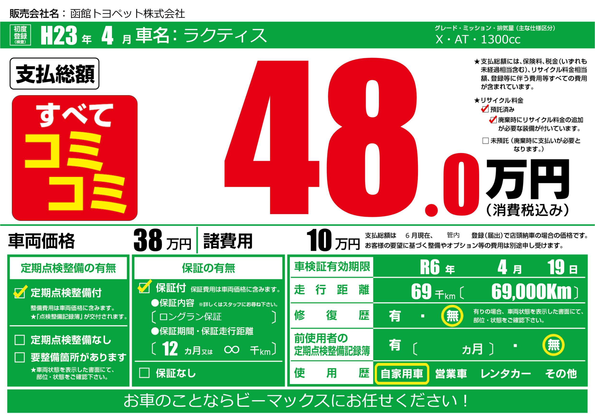 | 車名 | ラクティス | グレード ミッション 排気量 |