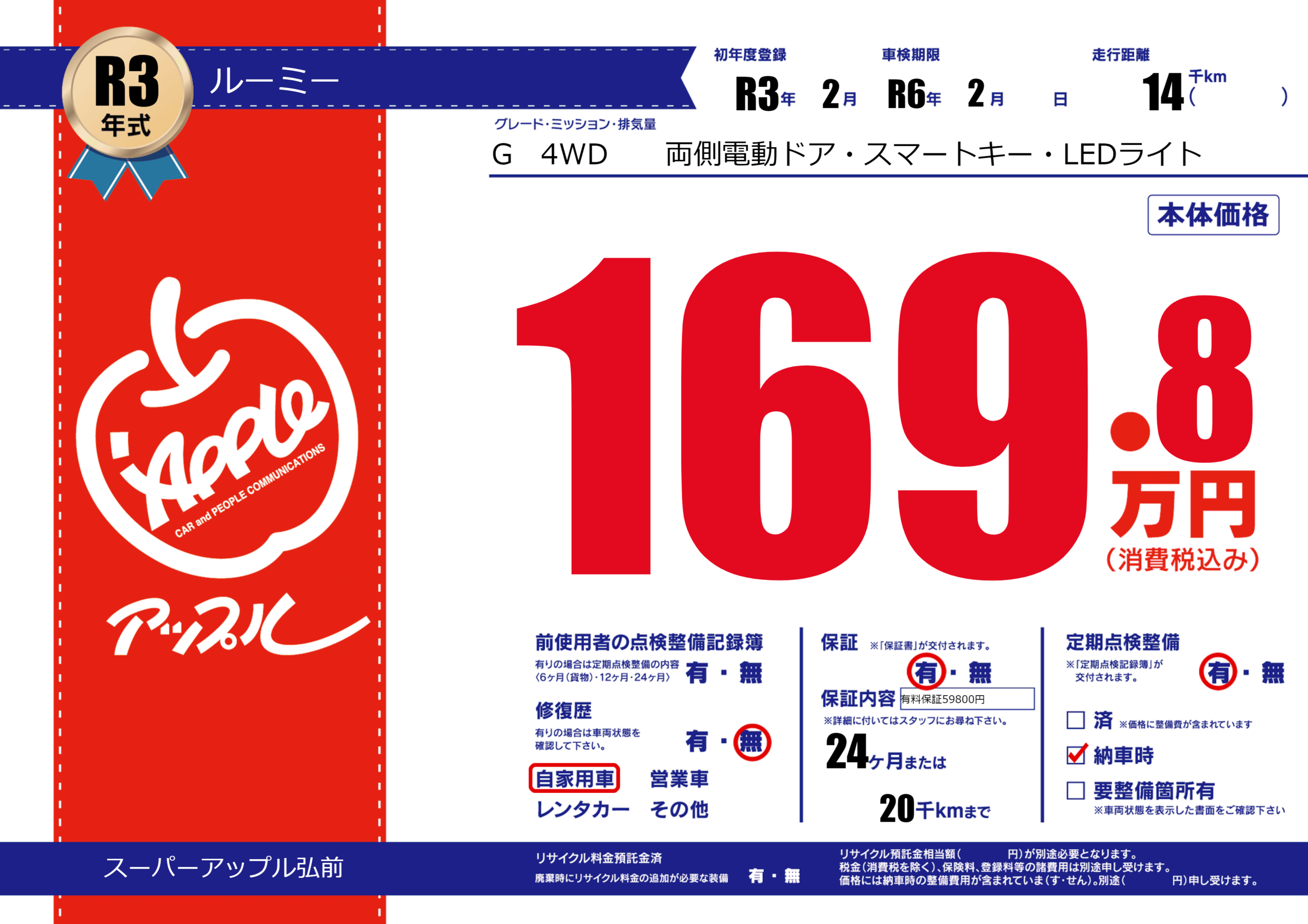 保証付き 保証内容(有料保証59800円) 24ヶ月または(20)千kmまで |