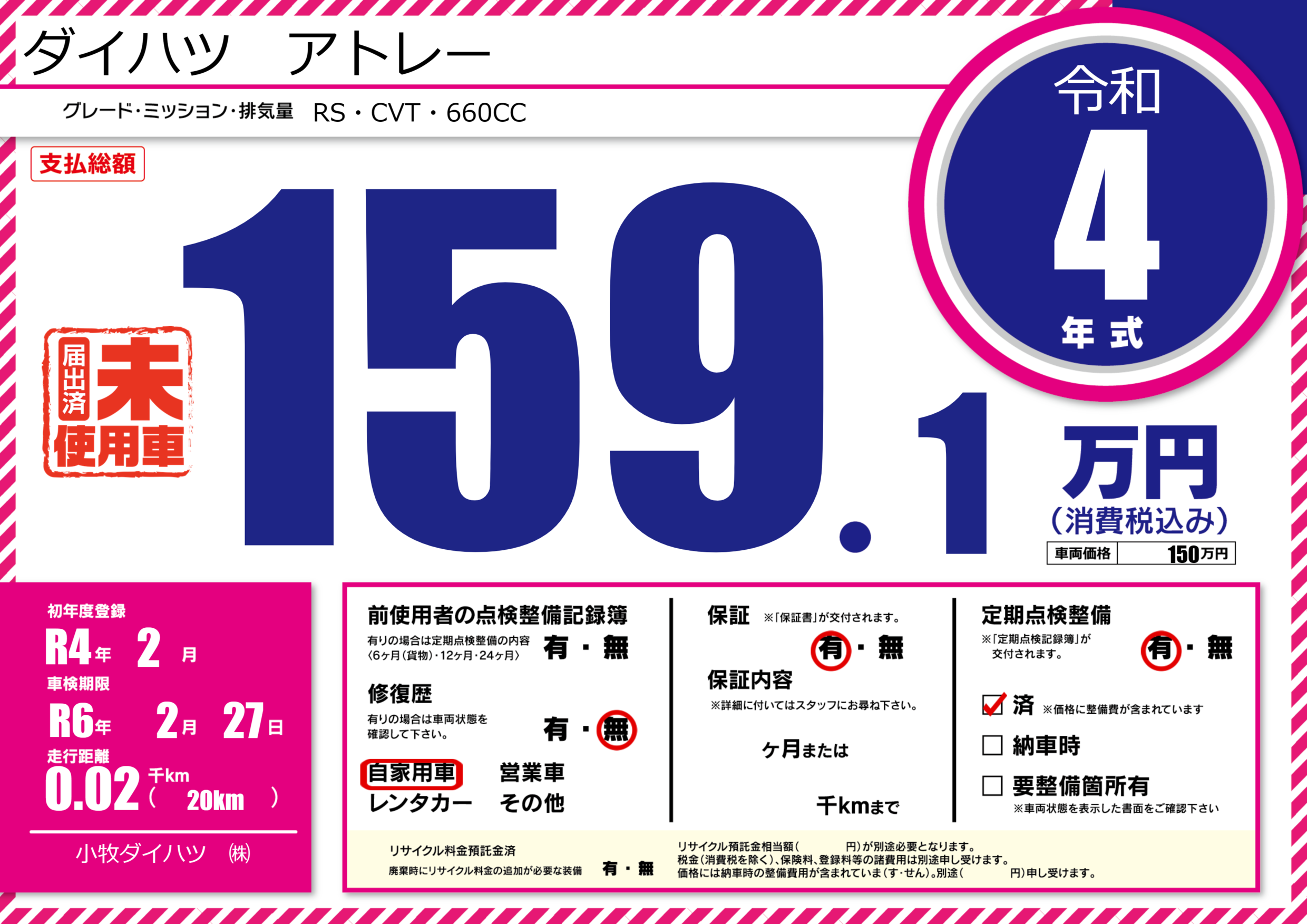 | 定期点検整備 | 定期点検整備あり 定期点検整備済み | ||