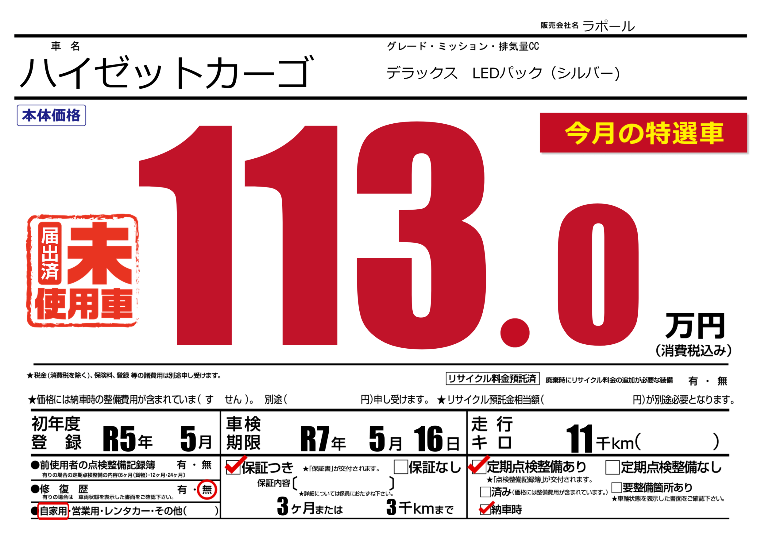 | 走行キロ | 1.1万km | 初年度登録 | R5年5月 |