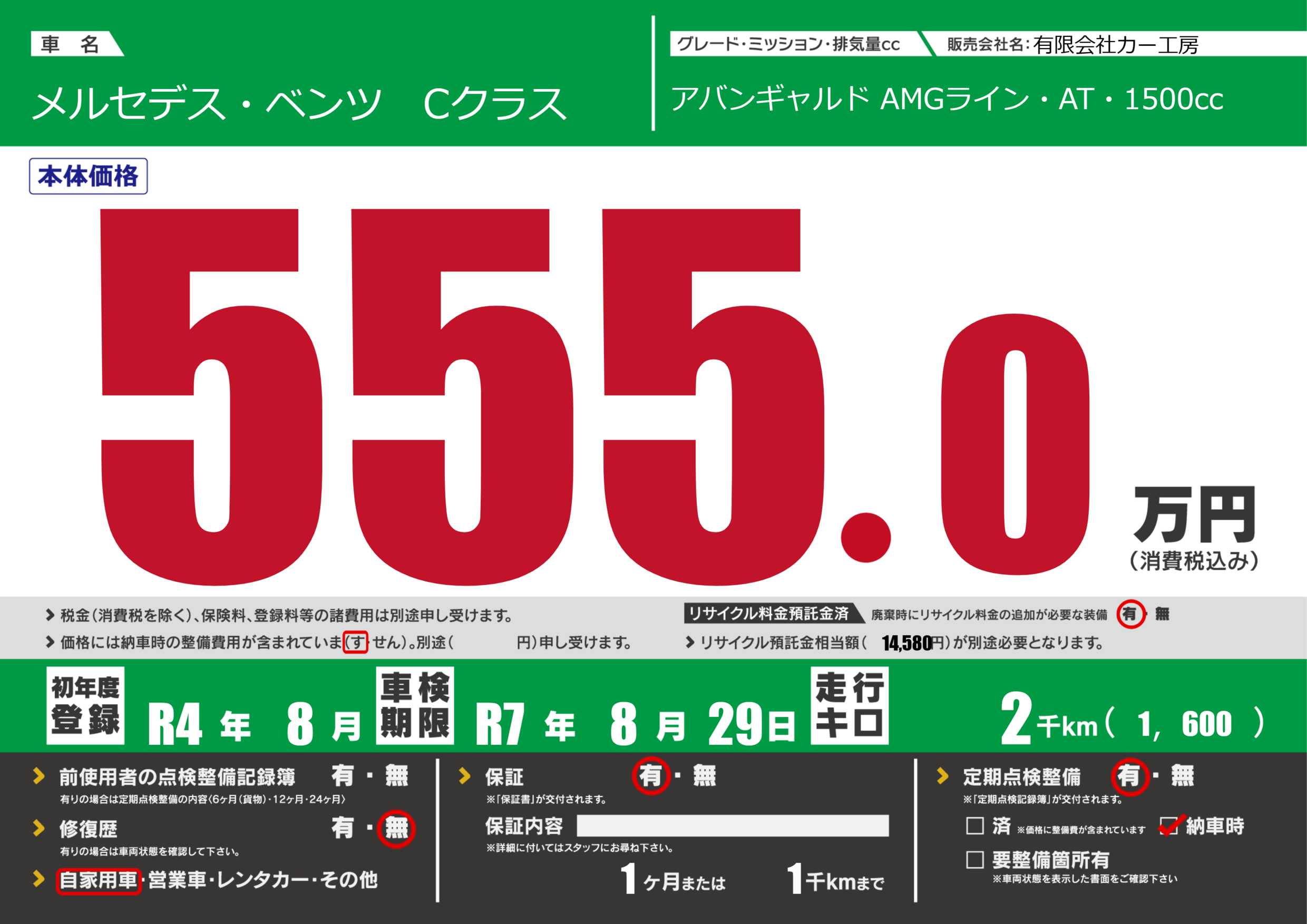 | 車名 | メルセデス・ベンツ Cクラス | グレード ミッション 排気量 |