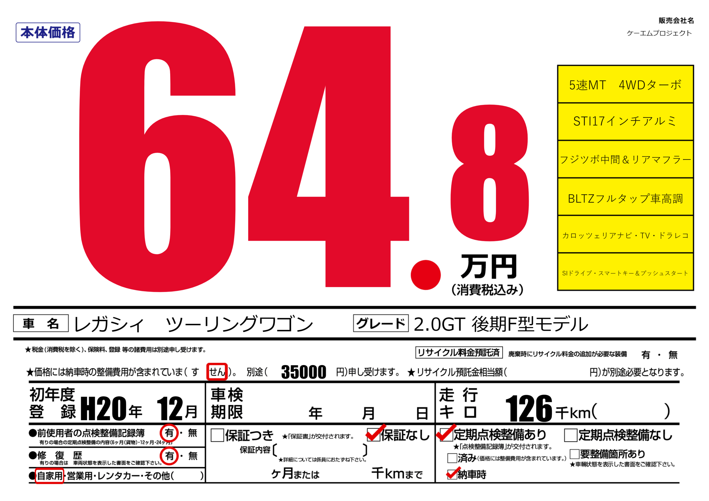 | 車名 | レガシィ ツーリングワゴン | グレード ミッション 排気量 |