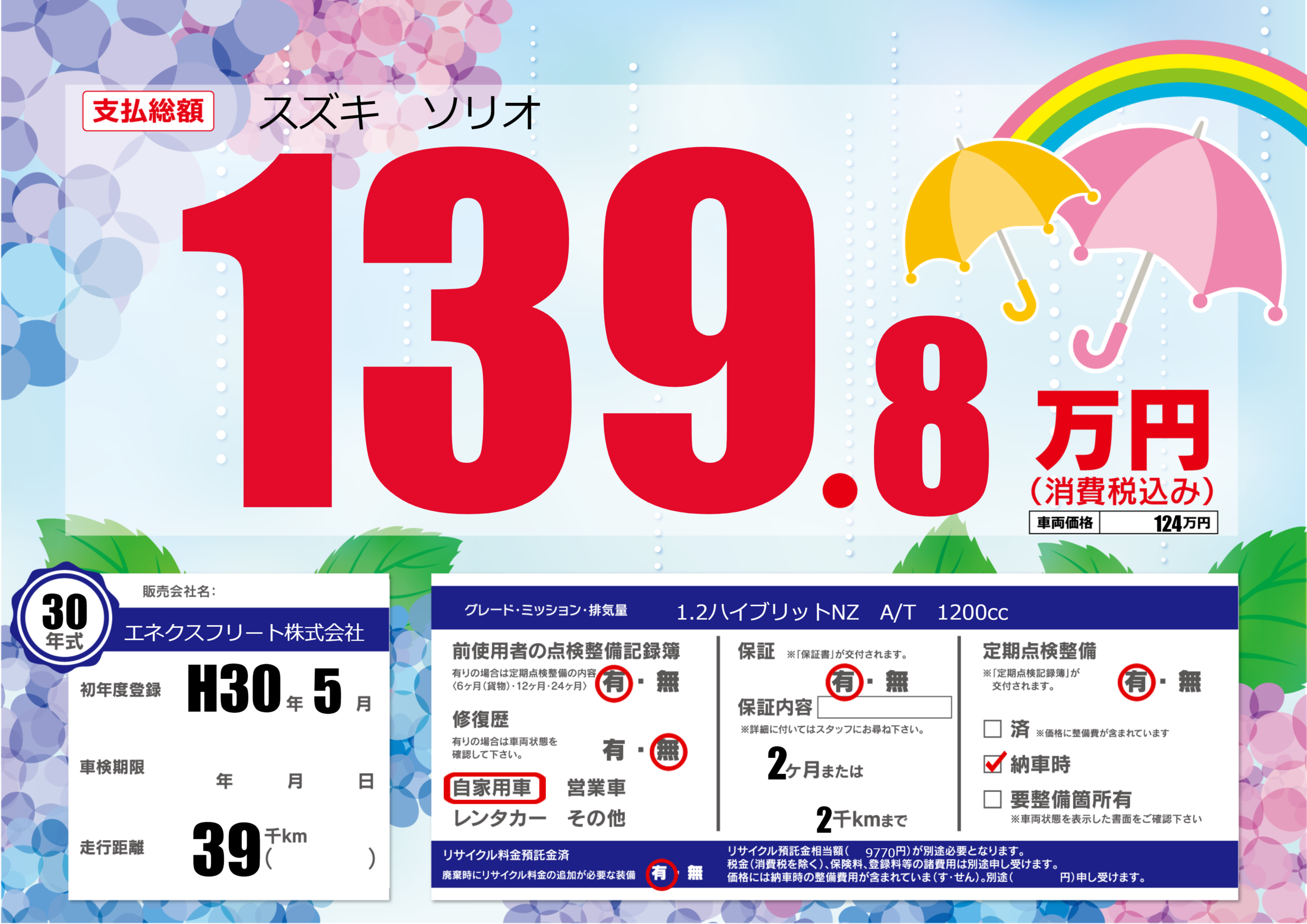 | 定期点検整備 | 定期点検整備あり 納車時あり | ||