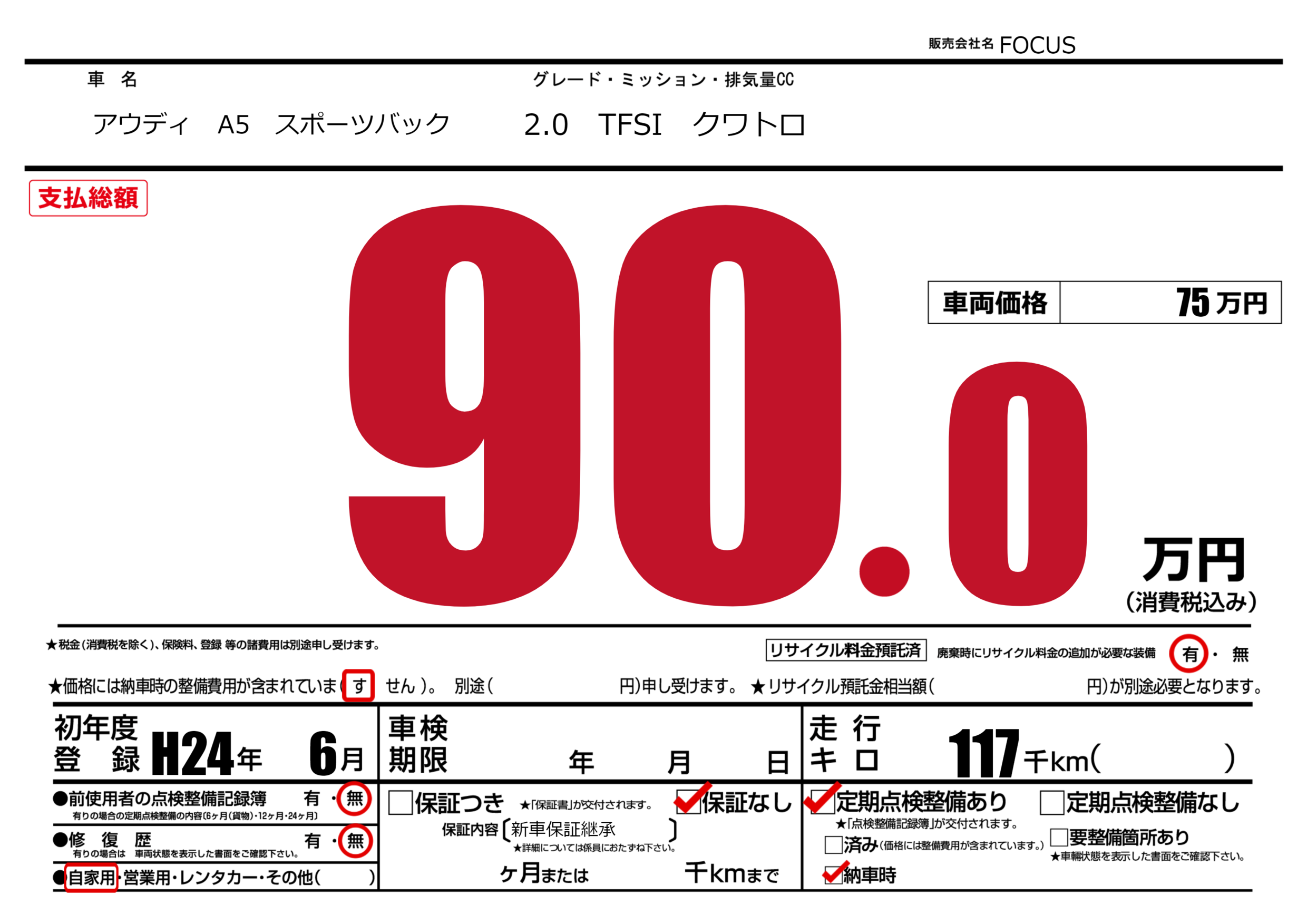 | 車名 | アウディ A5 スポーツバック | グレード ミッション 排気量 |