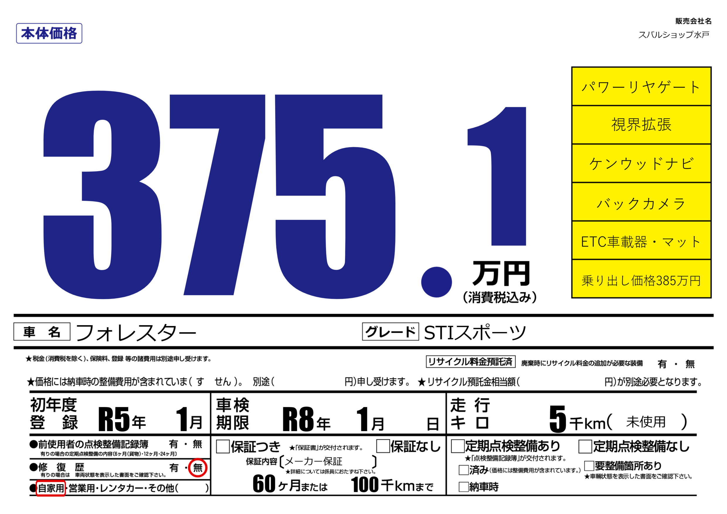 | 車名 | フォレスター | グレード ミッション 排気量 |