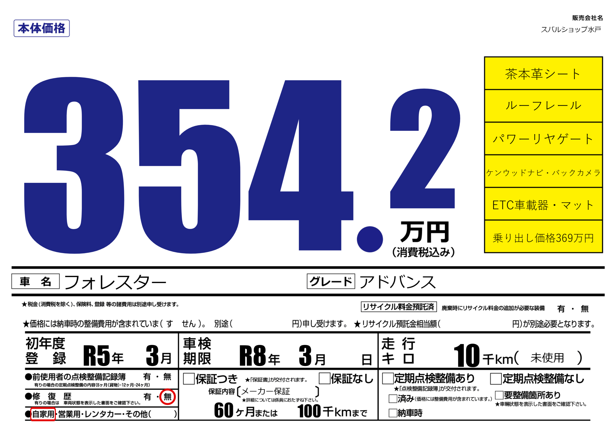 | 車名 | フォレスター | グレード ミッション 排気量 |