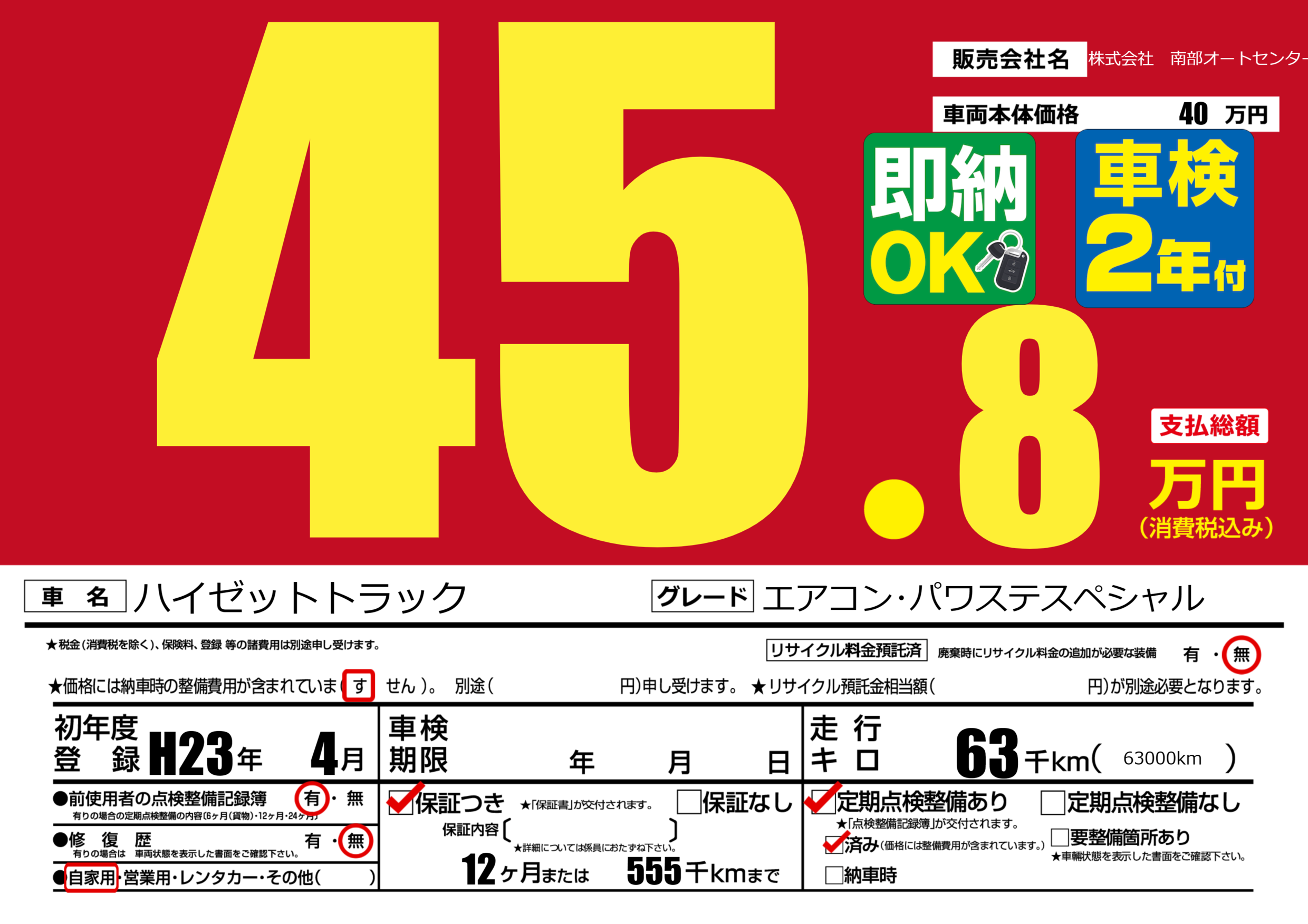 | 定期点検整備 | 定期点検整備あり 定期点検整備済み | ||