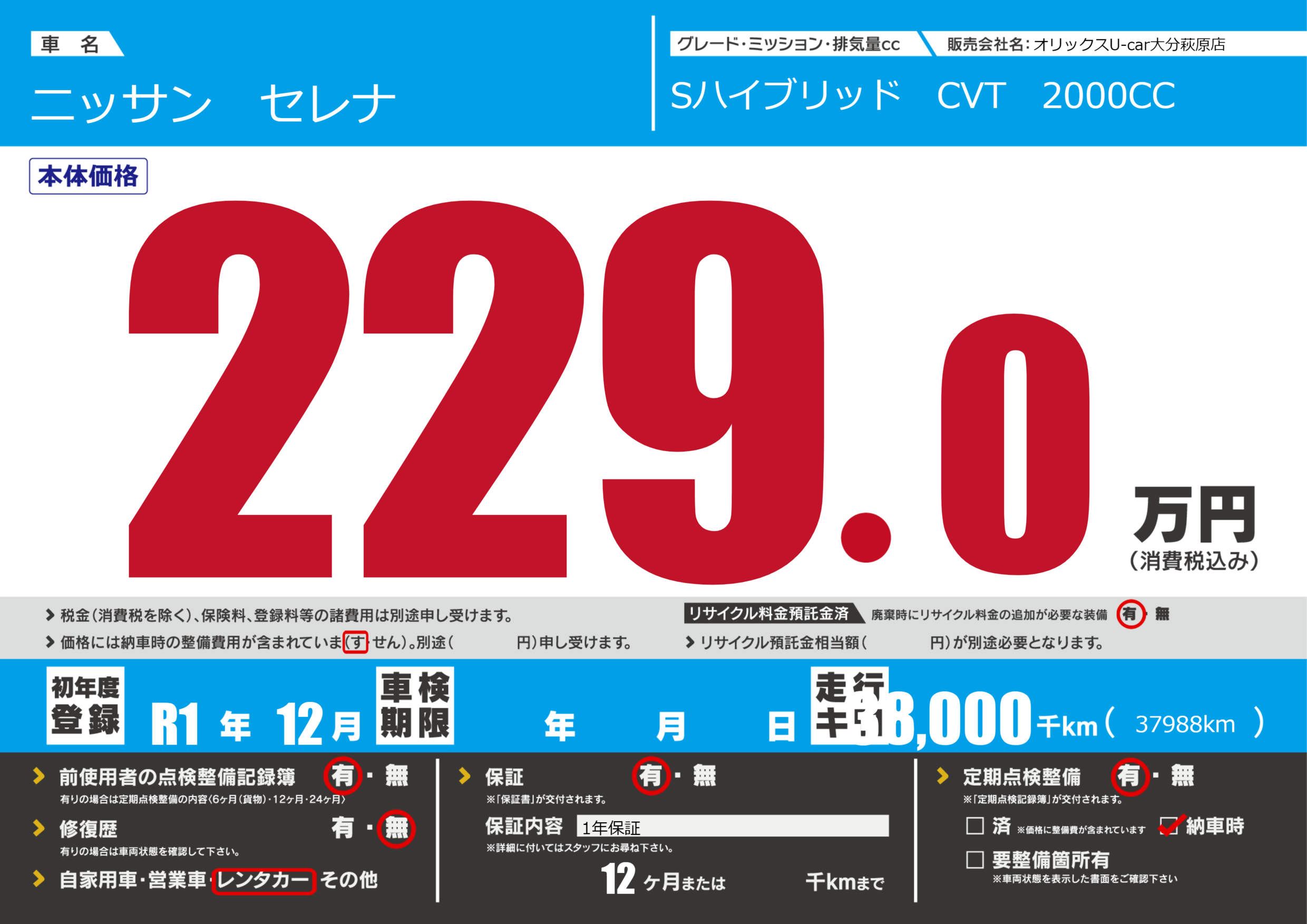 | 走行キロ | 3.8万km | 初年度登録 | R1年12月 |