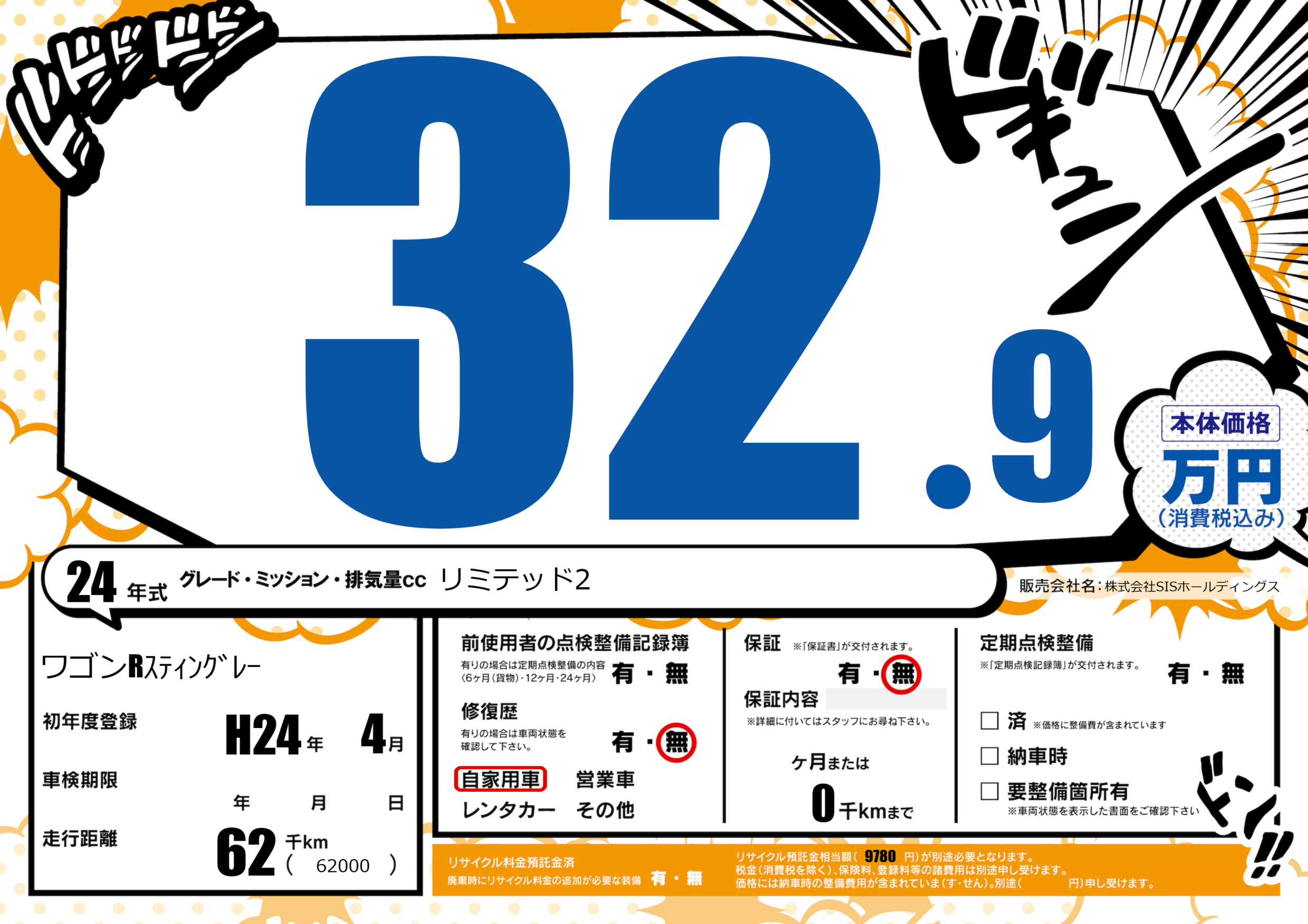 | 走行キロ | 6.2万km | 初年度登録 | H24年4月 |