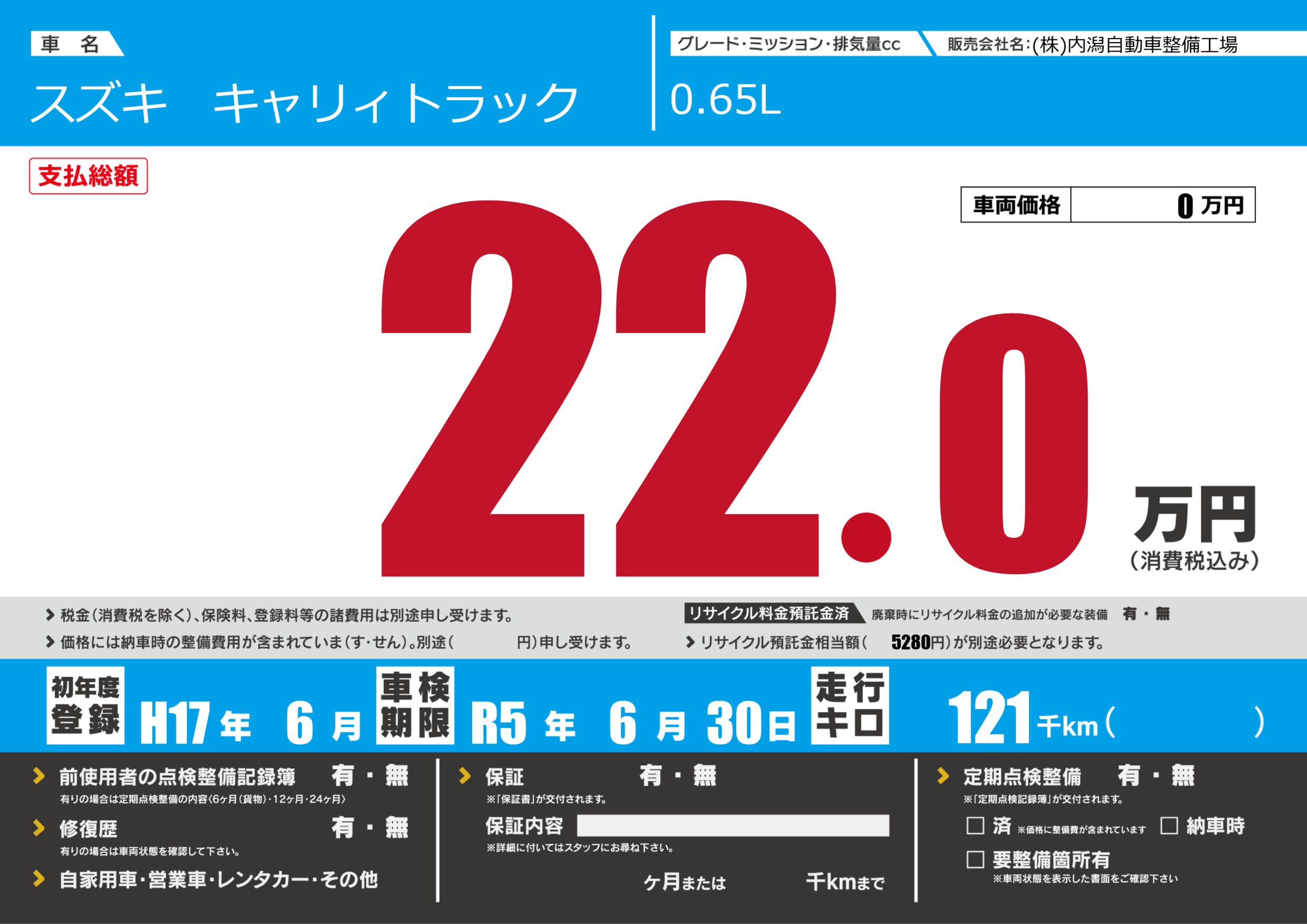 | 走行キロ | 12.1万km | 初年度登録 | H17年6月 |