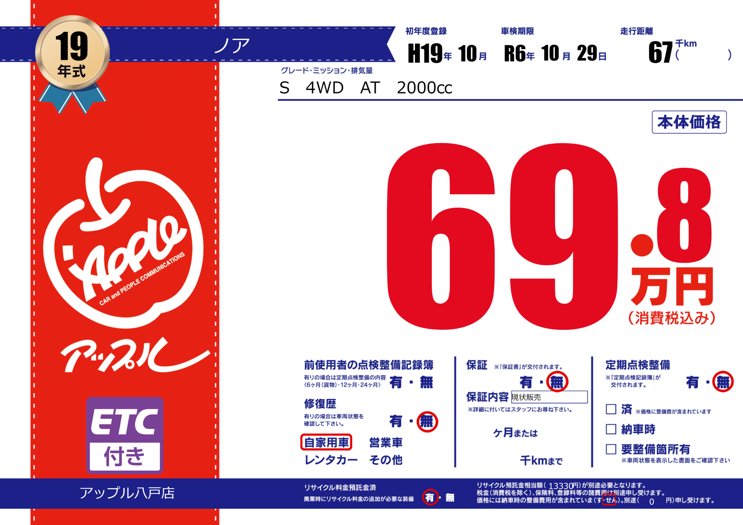 | 走行キロ | 6.7万km | 初年度登録 | H19年10月 |