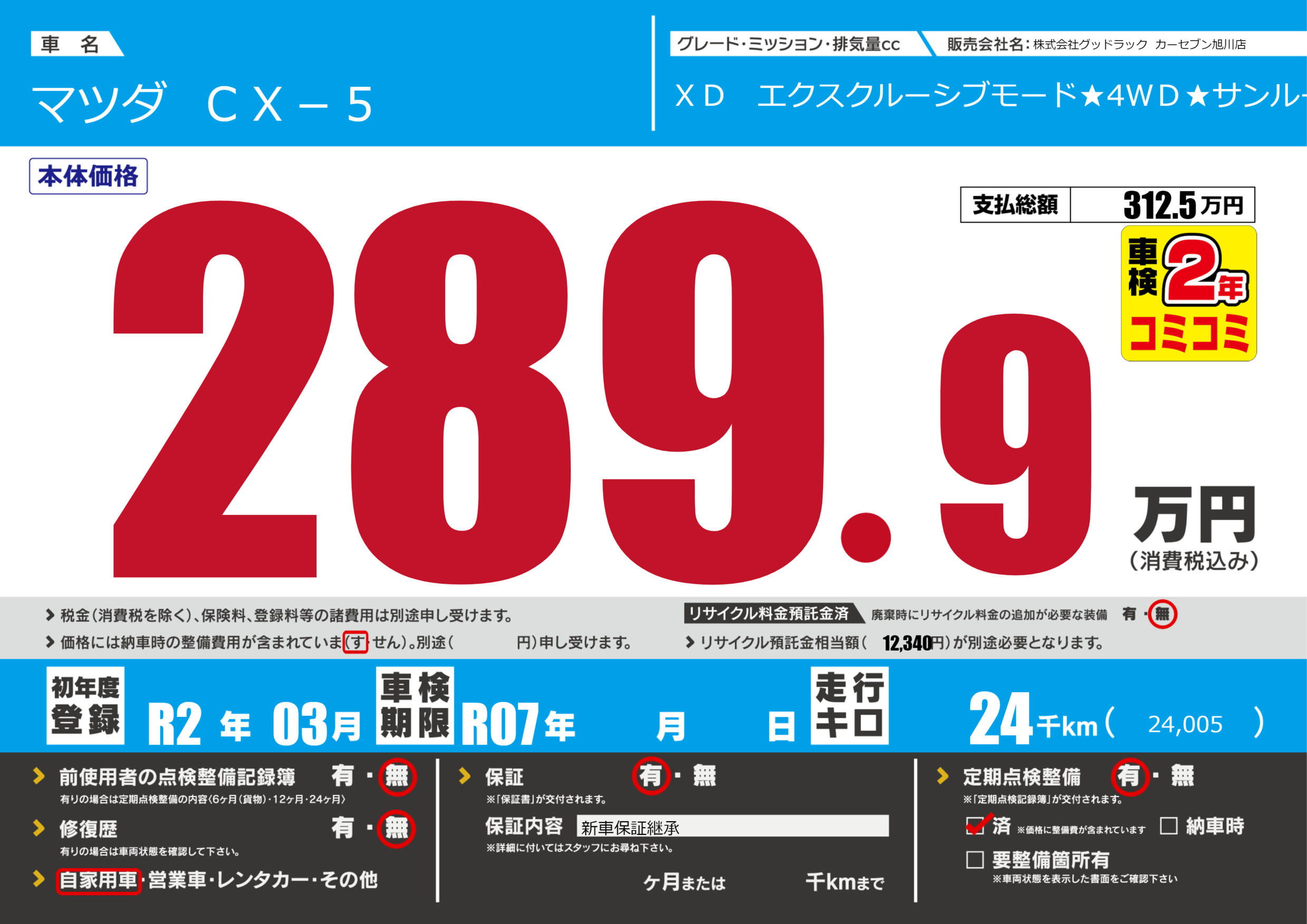 | 車名 | マツダ CX-5 | グレード ミッション 排気量 |