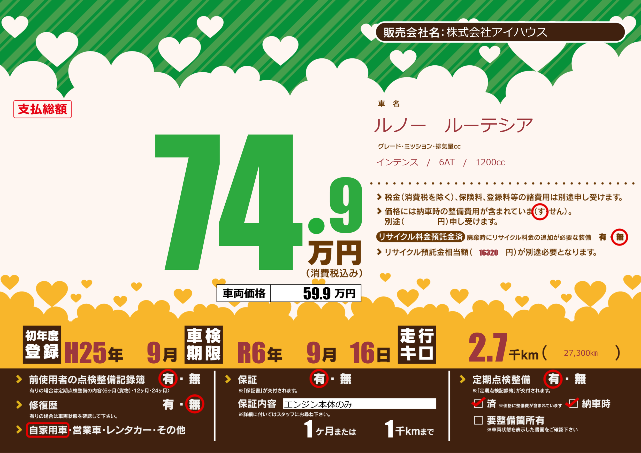 | 定期点検整備 | 定期点検整備あり 定期点検整備済み 納車時あり | ||