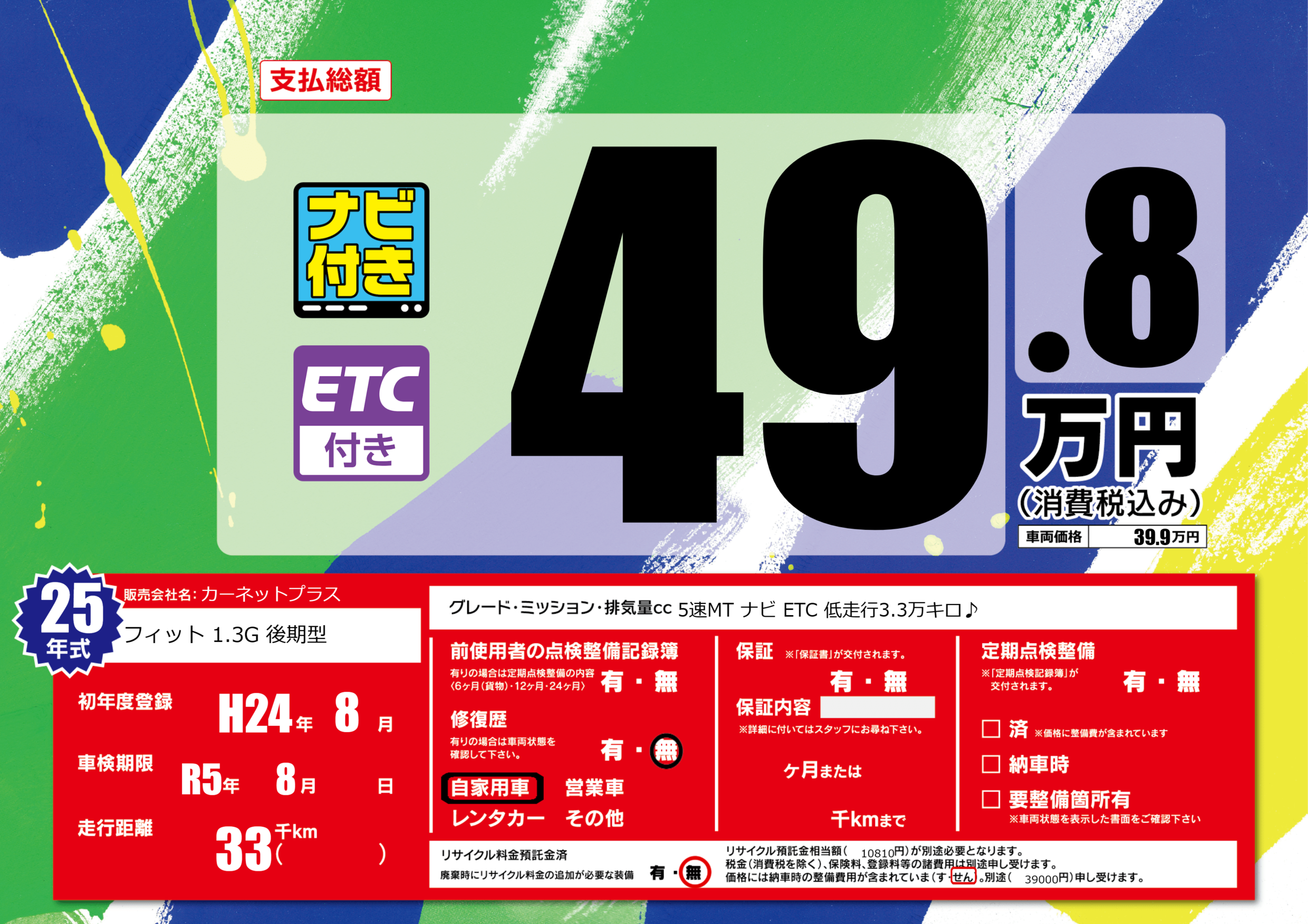 | 走行キロ | 3.3万km | 初年度登録 | H24年8月 |
