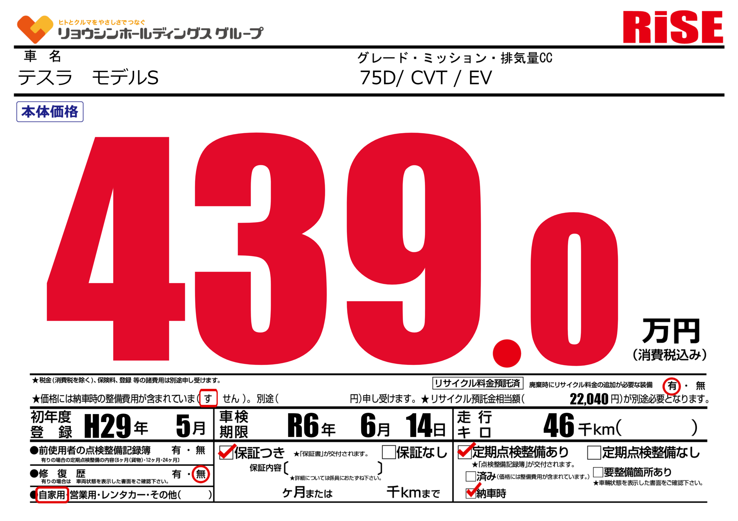 | 車名 | テスラ モデルS | グレード ミッション 排気量 |